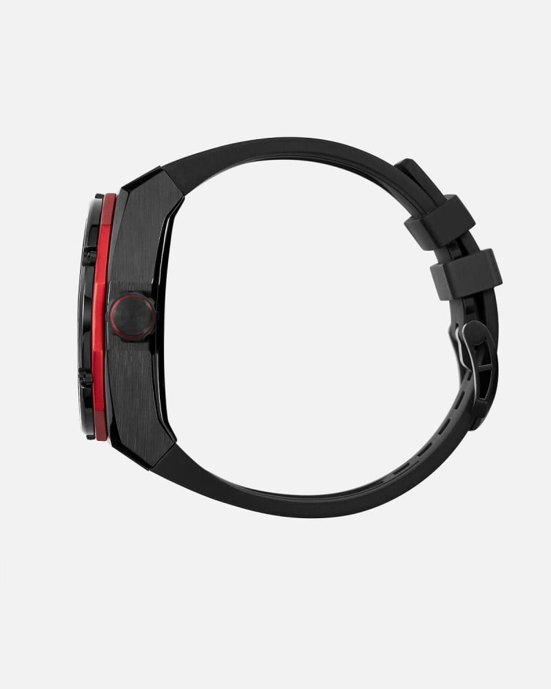 - ميناء الساعة يكشف تفاصيل المكينة و بإطار عريض باللون الأسود وتداخل اللون الأحمر بمقاس: 45 mm