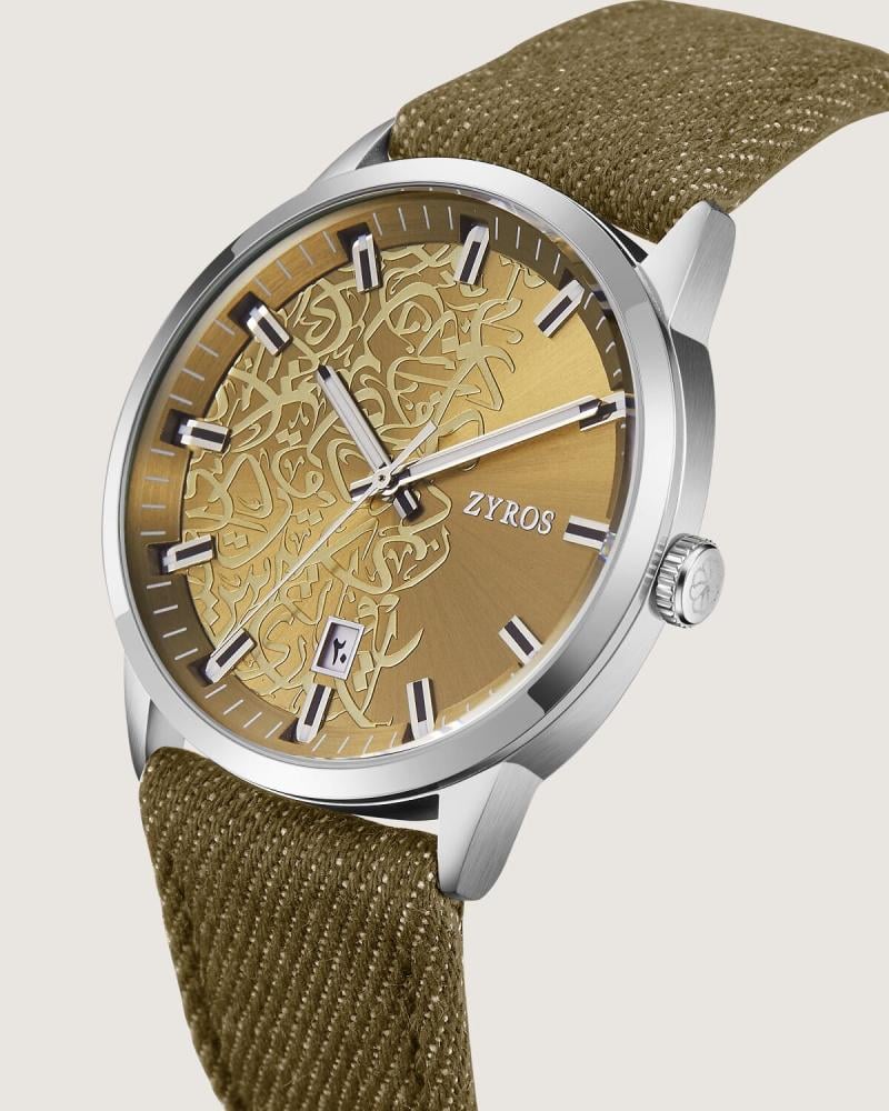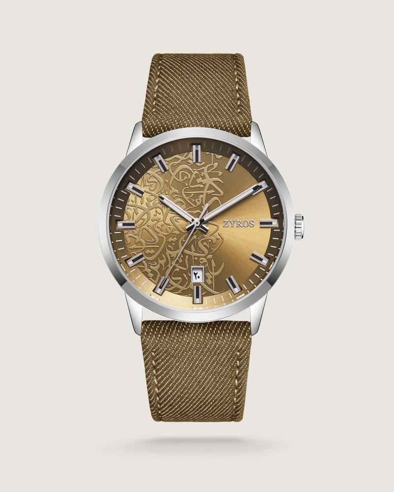 ساعة رجالية تجمع بين الأصالة والحداثة، بسير قماشي أنيق يمنح راحة وأناقة يومية، وميناء يزدان بزخارف الخط العربي كلوحة فنية تنبض بالتراث. تصميم يجسّد روح الهوية الشرقية في قالب عصري فريد