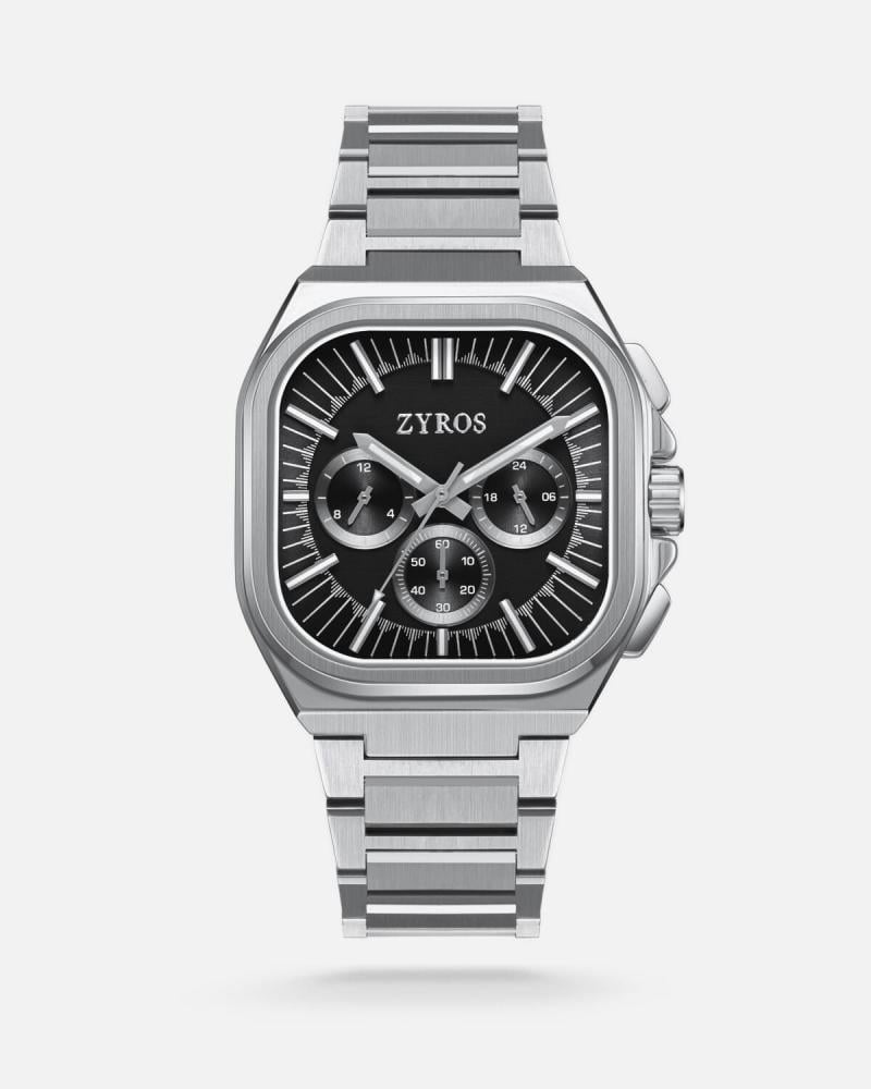 تجسد هذه الساعة مزيجًا رائعًا بين الفخامة والأناقة العصرية، حيث يتناغم الفولاذ المقاوم للصدأ مع لمسات اللون الفضي الفاخر ليمنحها طابعًا ملكيًا. تصميمها الهندسي مستوحى من الأيقونات الكلاسيكية، عقاربها اللامعة تنساب بانسيابية فوق التفاصيل الدقيقة، مع عدادات تزيد دقتها وأناقتها. إنها ليست مجرد ساعة، بل بيانٌ من الأناقة والتميز لمن يقدرون الفخامة في أدق تفاصيلها.