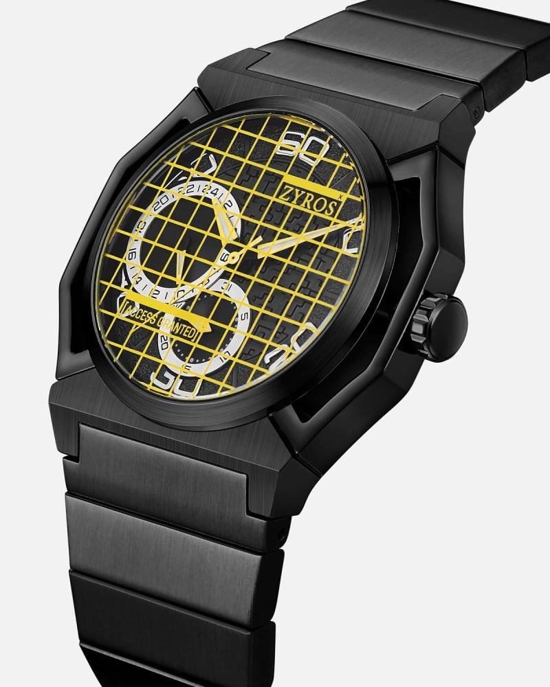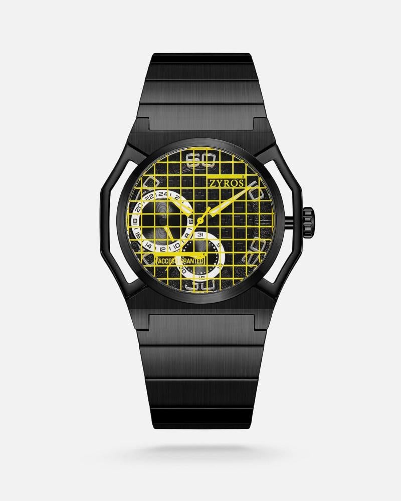 عندما تندمج التقنية بالفن ساعة بتصميمها العصري الهندسي تتشابط الخطوط الصفراء على ميناءها الأسود كأنها خريطة لمجرة بعيدة ، حيث تتقاطع المسارات لتكشف عن لغز الوقت ، عقاربها تسير بثقة تتبع مسار النجوم ، وتكشف النواافذ الصغيرة عن دوائر الزمن المتداخلة ، ساعة تحاكي المستقبل حيث يلتقي الإبداع بالدقة .