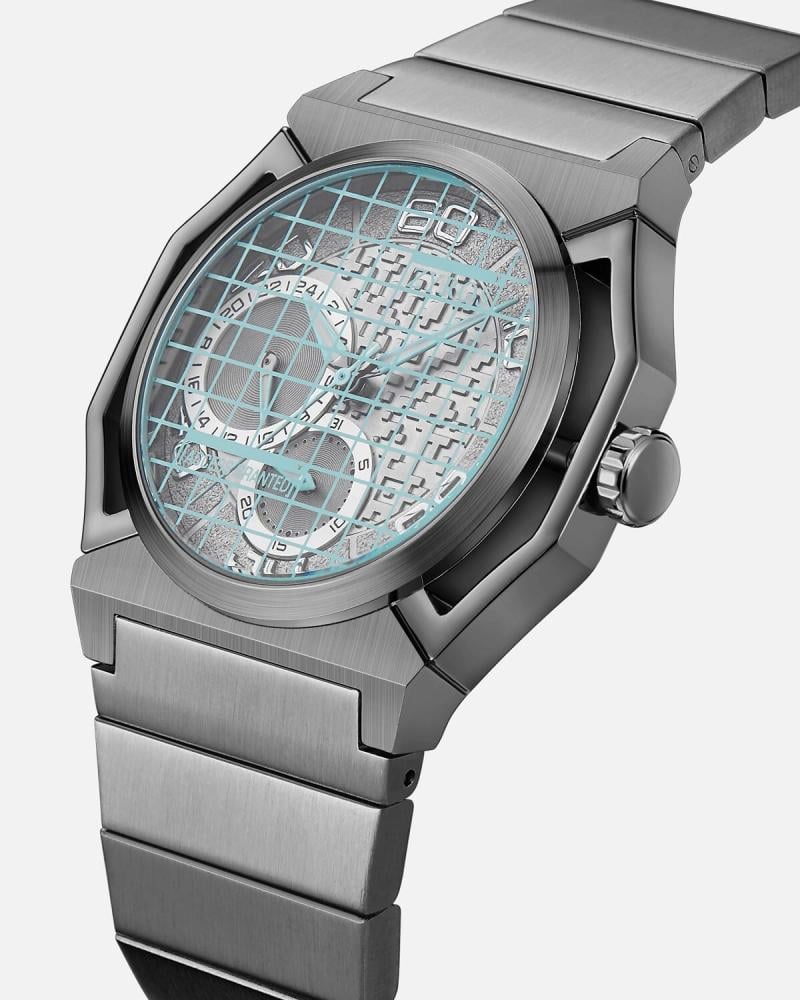 عندما تندمج التقنية بالفن ساعة بتصميمها العصري الهندسي تتشابط الخطوط الزرقاء على ميناءها الأسود كأنها خريطة لمجرة بعيدة ، حيث تتقاطع المسارات لتكشف عن لغز الوقت ، عقاربها تسير بثقة تتبع مسار النجوم ، وتكشف النواافذ الصغيرة عن دوائر الزمن المتداخلة ، ساعة تحاكي المستقبل حيث يلتقي الإبداع بالدقة .
