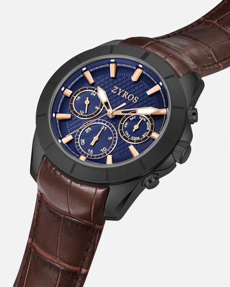 - ساعة بميناء بلون أزرق يتميز بعدادات لقراءة الوقت بدقة
