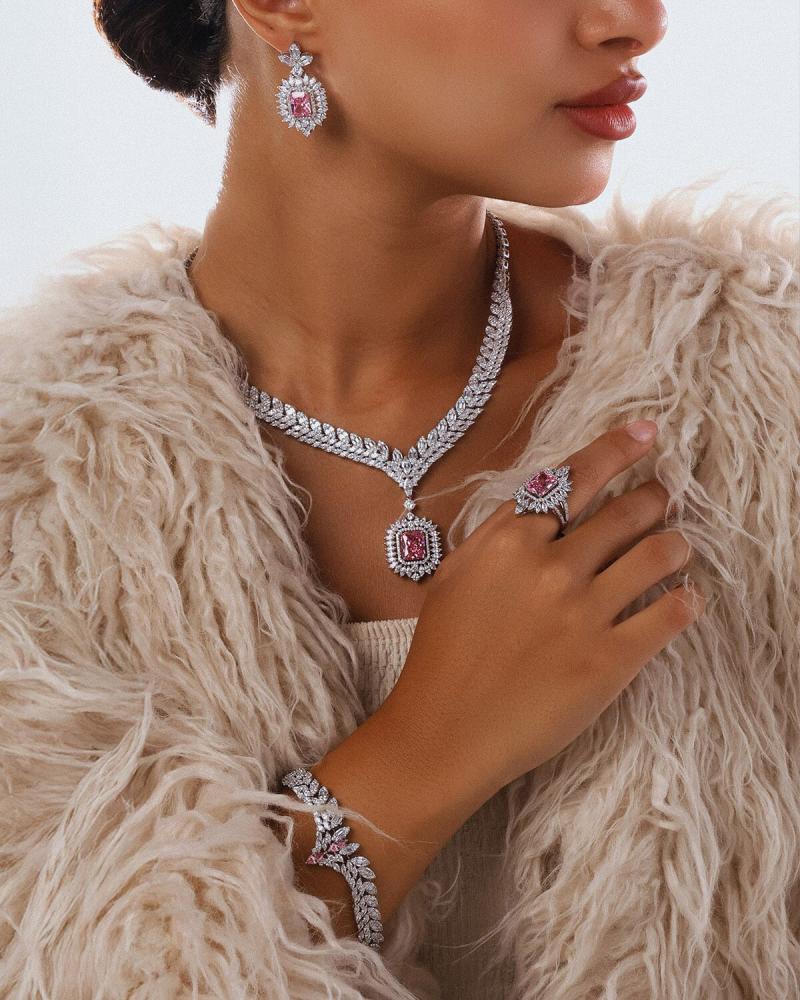 طقم إكسسوار نسائي فاخر يتكون من عقد أنيق، أسوارة فاخرة، حلق ساحر، وخاتم مبهر، جميعها مرصعة بفصوص الزركون اللامع الذي يضفي عليها بريقًا لا يقاوم وتتزين بحجر زركون بلون وردي. كل قطعة مصممة بدقة لالتقاط الضوء وإبراز جمالكِ في كل لحظة، مما يضمن لكِ إطلالة ساحرة ومفعمة بالفخامة والأنوثة. الطقم مثالي ليكمل أي إطلالة راقية ويضيف لمسة من التألق والجاذبية على أسلوبكِ.