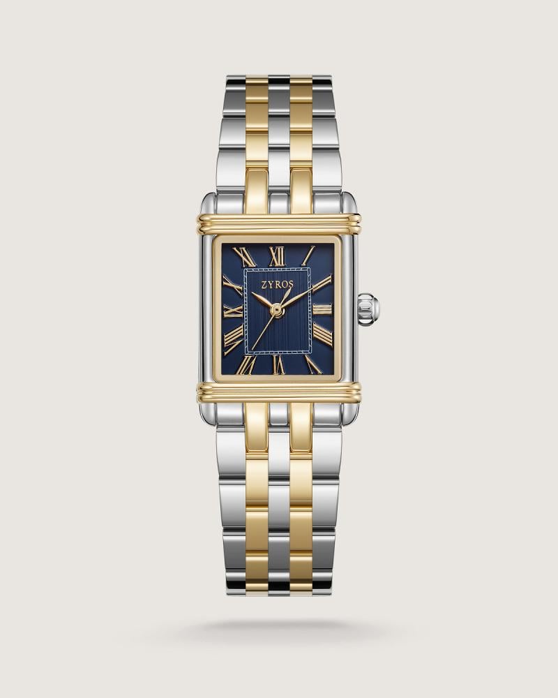 ساعة نسائية تنبض بالأنوثة والفخامة، يتألق ميناؤها المستطيل بأرقام رومانية تروي حكاية زمن راقٍ لا يبهت. خطوطها الهادئة تنسجم مع سوارها الذهبي لتصنع حضورًا استثنائيًا، كنبضة فخر خفيّة تلامس القلب وتُذكّر بروح وطن عزيز يظل شامخًا في الوجدان.