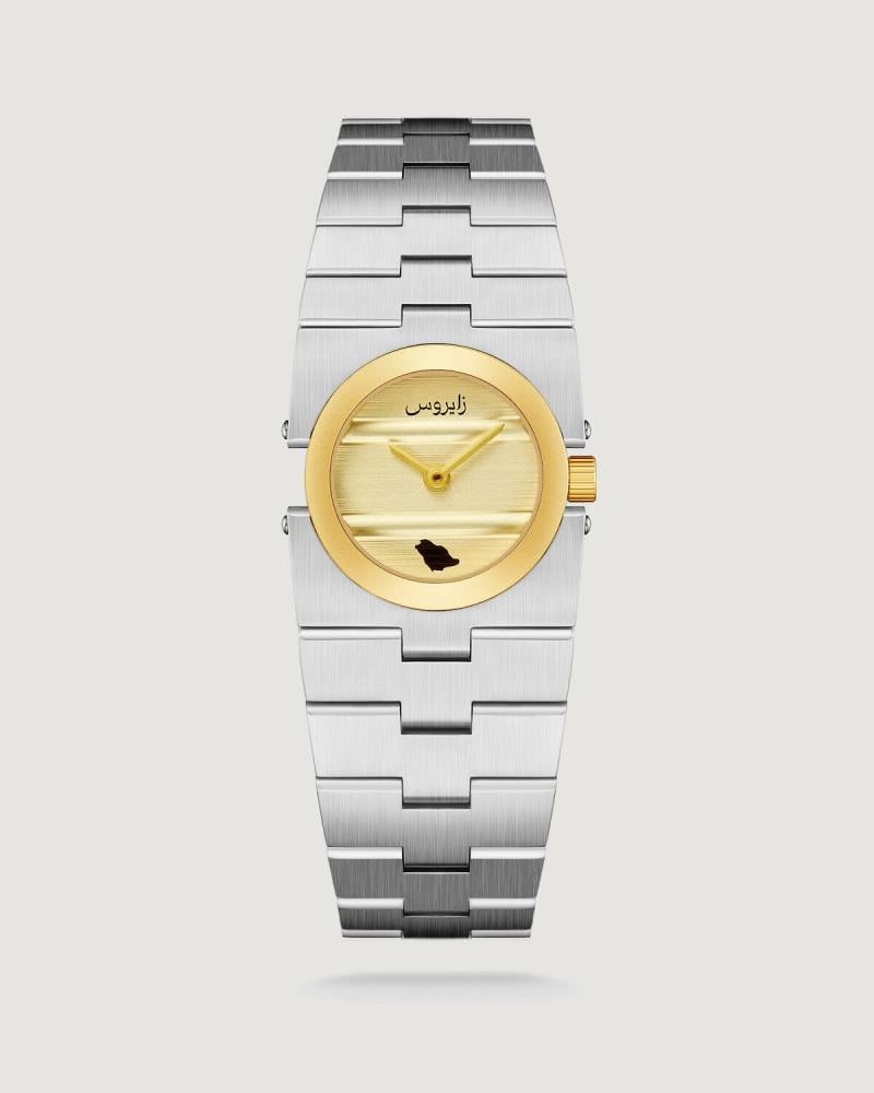 كل تفصيلة في الساعة تتحدث بلغة الحاضر الممزوجة بروح التصميم الكلاسيكي. سيرها الفضي من الستانلس ستيل ينساب برقة حول معصمك، ليعكس وهجًا يتناغم مع حضورك، ميناؤها الذهبي الصغير، بحجم 19 مم، يحتضن الضوء برقة، بينما الإطار الفضي يحيط بها ليبرز جمالها.