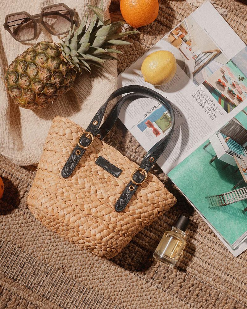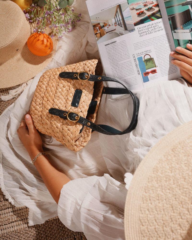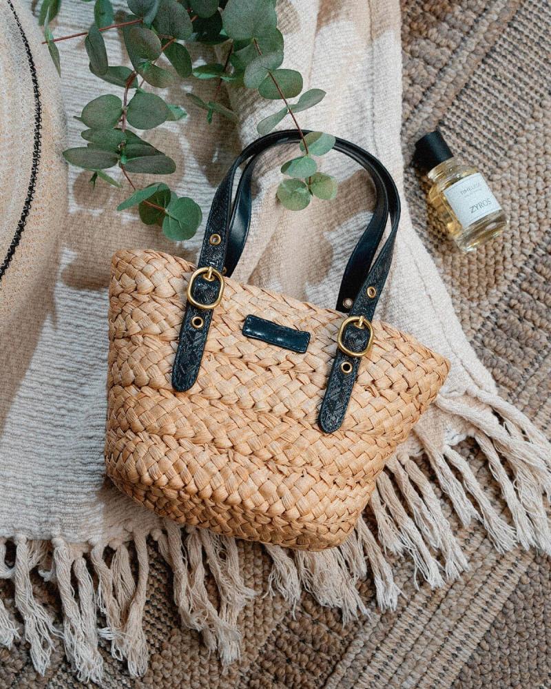 - الشنطة : مصنوعة من الخوص الفاخر بلون بيج وبيد من الجلد النباتي الأنيق بلون أزرق، تجمع بين السعة وأناقة التصميم، لتكون خيارك الأول في أيام الصيف.
