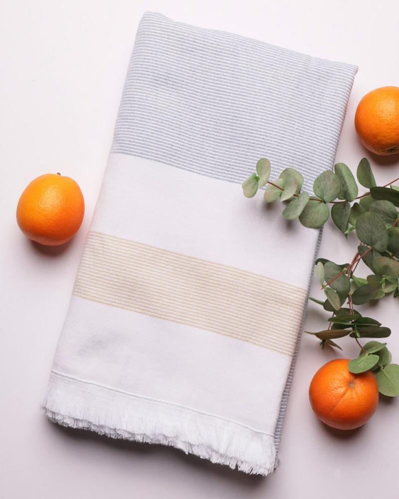 - منشفة بتصميم أنيق من القطن 100% ، تتميز بنعومتها وقوتها العالية لإمتصاص الماء، حجمها المثالي يجعلها رفيقة يومية في أيام البحر.