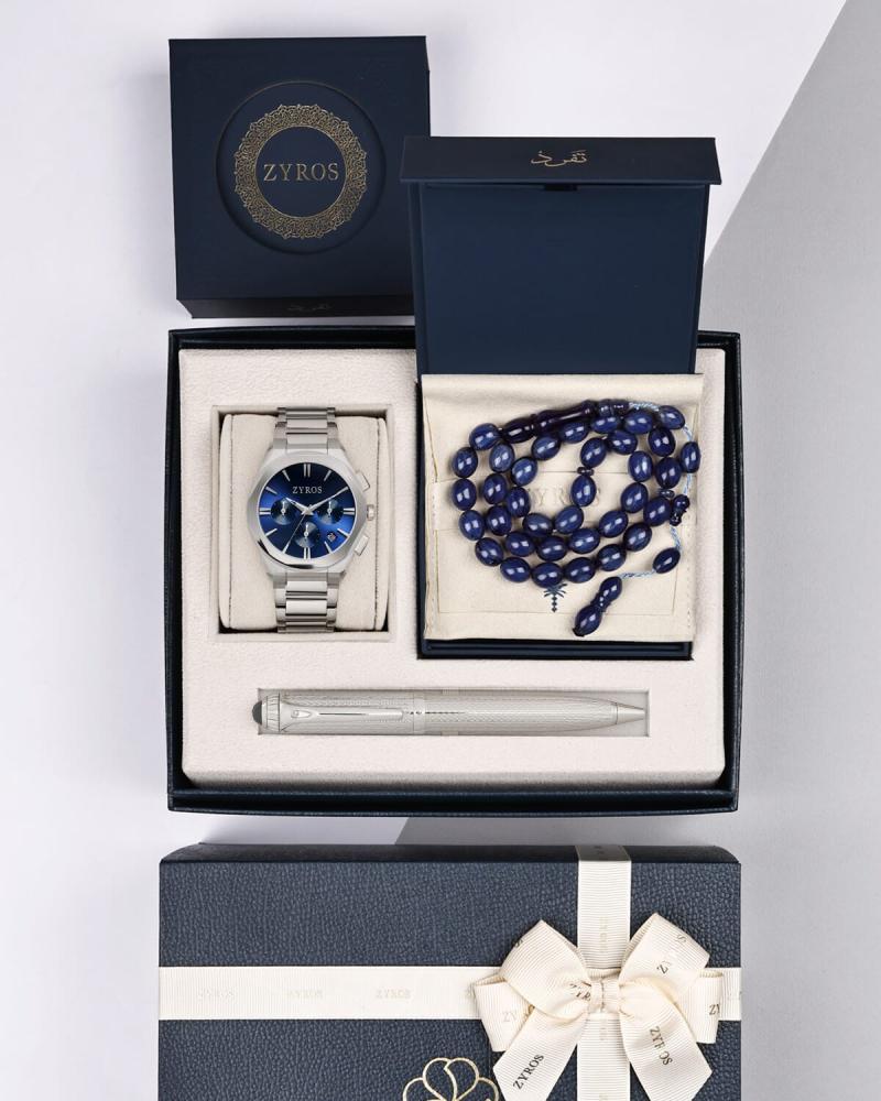 سبحة تتدلى حباتها كأنها قطرات ندى، تذكر بالسكينة والروحانية، وتدعوك للتأمل في جمال اللحظات. مع القلم الذي يلمع بريقه كأنه نجم ساطع، ينتظر أن يخط أجمل الكلمات، ويعبر عن أعمق المشاعر.و الساعة تتألق كأنها قطعة فنية، تذكر بأهمية الوقت، وتدعوك لتقدير كل لحظة في الحياة. هذا البوكس ليس مجرد هدية، بل هو تحفة فنية تجمع بين الأصالة والأناقة، والروحانية والجمال، والتقدير والذوق الرفيع. هدية تترك أثرًا طيبًا في النفس، وتُخلد ذكرى جميلة.