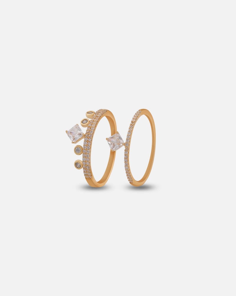 خاتم نسائي من ماركه زايروس ، طقم خواتم توينز بتصميم ناعم باللون الذهبي ، يتميز الخاتم بتصميمه الراقي البسيط ، خاتمين بتصميم رفيع أنيق وناعم ، يتميز احدى الخاتمين بفصوص زركون بخط رفيع و بفص بشكل هندسي بارز في المنتصف ، والخاتم الاخر اعرض بصفين من فصوص الزركون وبفص بارز بشكل هندسي وبجانبه فصين دائريه صغيره لامعه ، نسقي الخاتم مع إحدى أساور زايروس لتكتمل إطلالتك .