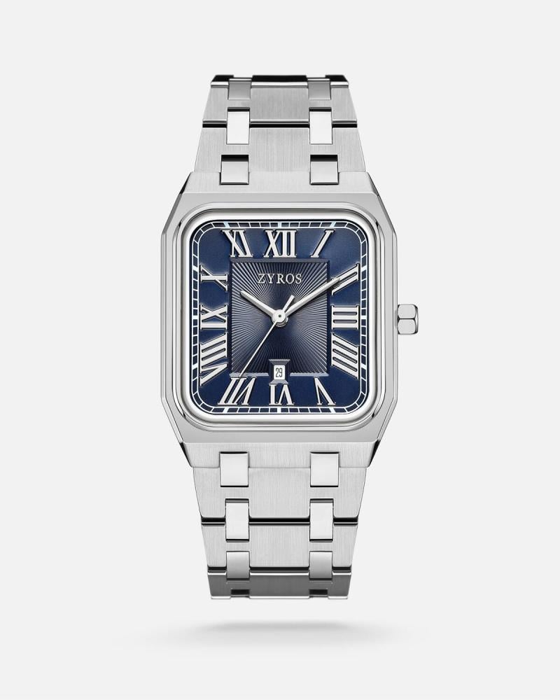 - الساعة الرجالية بسير من الستيل باللون الفضي بميناء باللون الأزرق صممت الساعة بمقاس 30 mm