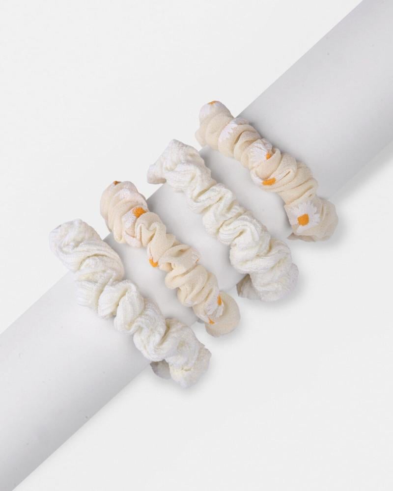 مجموعة من ربطات الشعر المصنوعة من قماش مطاطي مجعد، تتنوع بين التصاميم البسيطة والسادة باللون الأبيض، وأخرى مزينة بنقوش زهرية ناعمة تضفي لمسة أنثوية ساحرة. تتميز بحجمها المناسب للارتداء اليومي، مما يجعلها خيارًا عمليًا لإضافة لمسة أنيقة وعفوية إلى تسريحات الشعر.