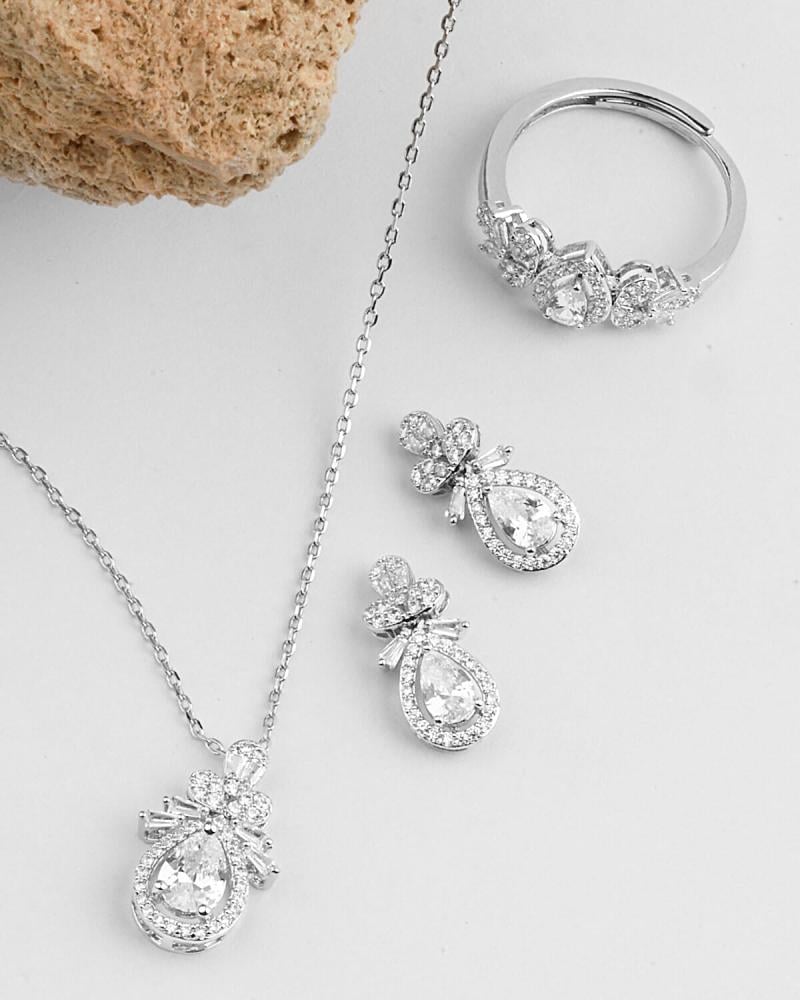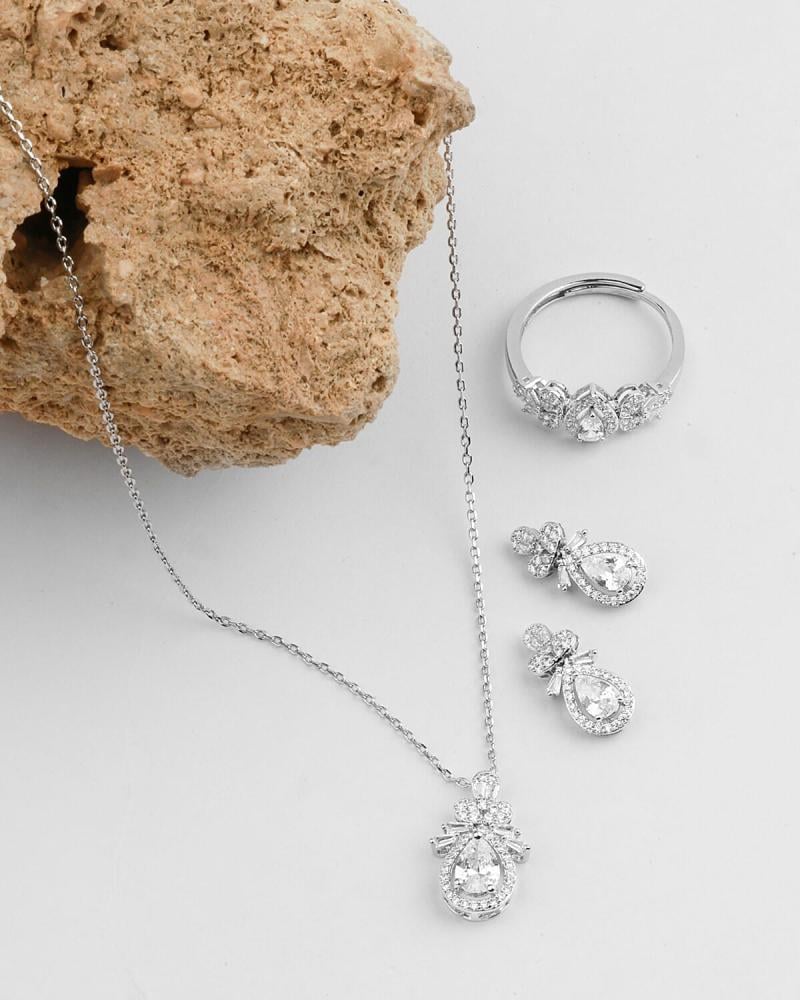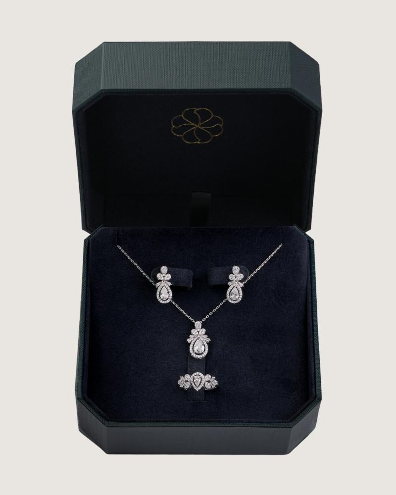 طقم إكسسوار نسائي ساحر يتألف من سلسال، خاتم، وحلق، جميعها مرصعة بأحجار الزركون اللامعة التي تتراقص مع الضوء فتضفي بريقًا يخطف الأنظار. تصميمه الفاخر والجذاب يمزج بين الأناقة والتميز، ليمنحكِ إطلالة مشرقة تنبض بالفخامة والتألق في كل لحظة.