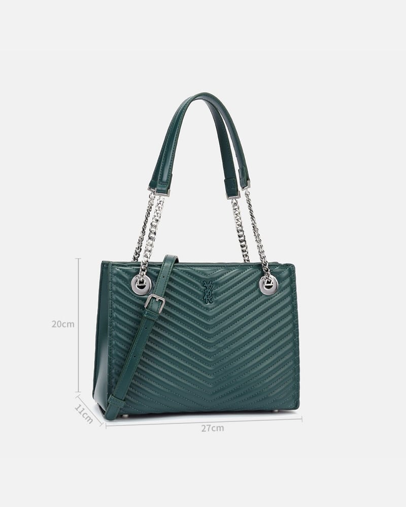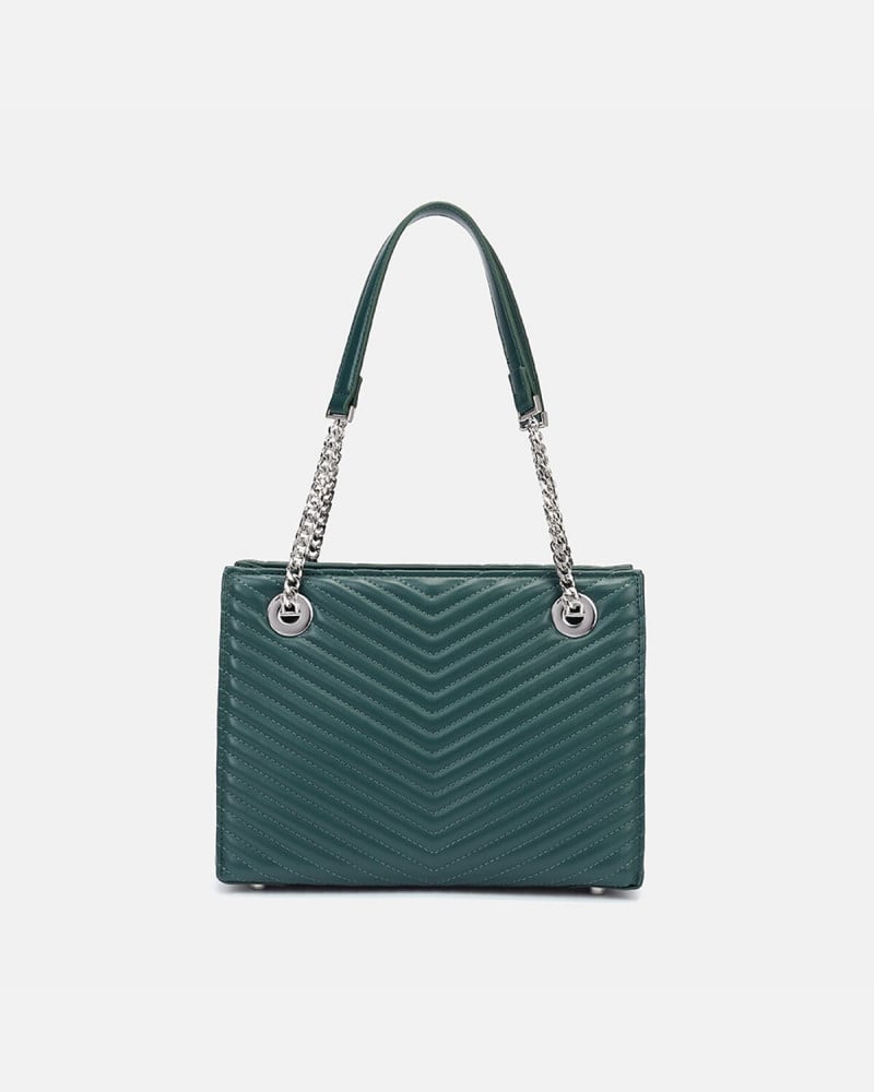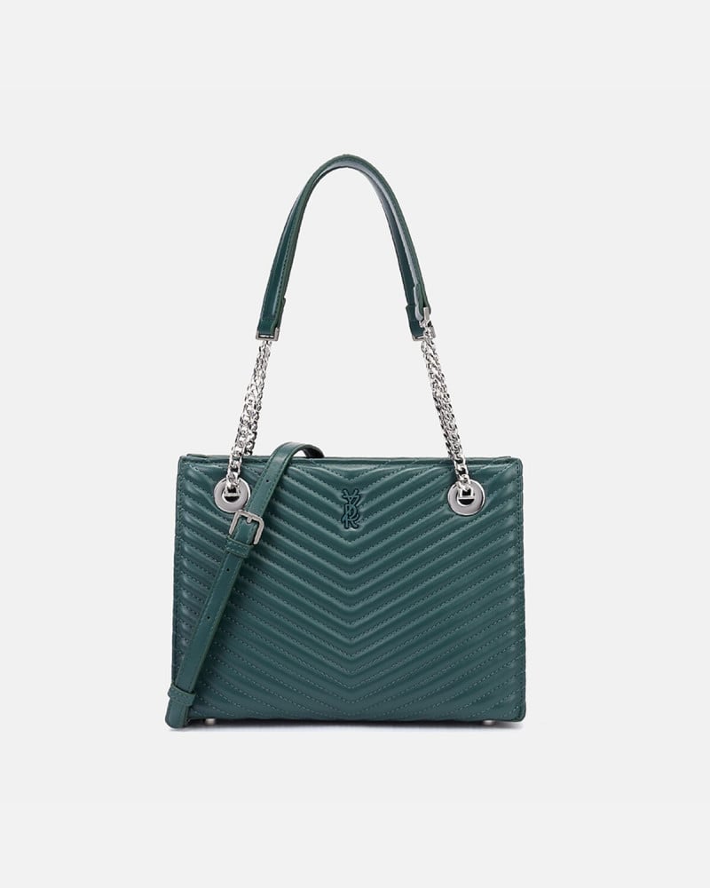 شنطة نسائيه من زايروس ، شنطه يد بتصميم أنيق من مجموعه الشنط الكلاسيكيه اليوميه بحجم واسع باللون الأخضر، شنطه مصنوعه من الجلد الناعم بخطوط هندسيه و بيد مقوسه مصنوعه من المعدن والجلد بتصميم سلسال عريض ومرفق مع الشنطه حامل إضافي قابل للإزاله لتتمكني من إرتداء الشنطه بطريقه كروس او بالطريقه المناسبه لإطلالتك ، لمحبي الشنط الكلاسيك فهذا الأختيار المناسب .