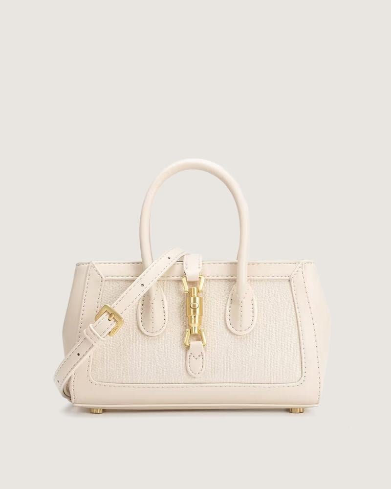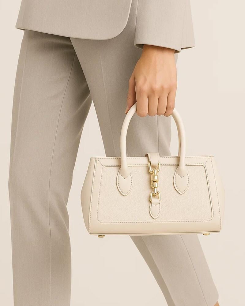 هذه الحقيبة الأنيقة بتصميمها الفاخر تجمع بين الكلاسيكية والحداثة بأسلوب راقٍ يعكس الذوق الرفيع ، بتصميم مستطيل أنيق يجمع بين الجلد الناعم والقماش المنسوج الفاخر، مما يمنحها ملمسًا فريدًا ومظهرًا استثنائيًا. تضيف التفاصيل المعدنية الذهبية لمسة من الفخامة، خاصة مع المشبك الأمامي الذي يمنحها طابعًا راقيًا وعصريًا في الوقت ذاته ، تناسب هذه الحقيبة الإطلالات الرسمية والكاجوال الفاخر، مما يجعلها خيارًا مثاليًا للمكتب، الاجتماعات، أو حتى الخروج بأناقة. قطعة لا غنى عنها لكل سيدة تبحث عن التميز!
