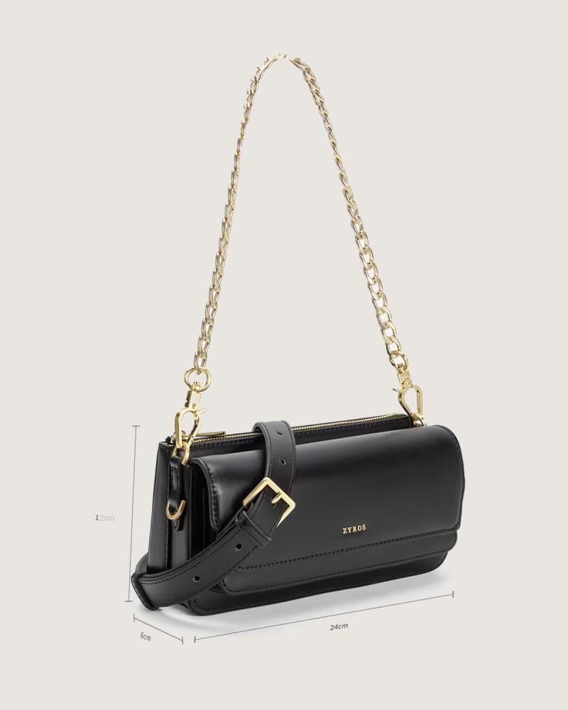 هذه الشنطة تجسيد للأناقة الراقية بلمسة من الغموض الساحر. بلونها الأسود العميق ونسيجها الجلدي الفاخر، تعكس هالة من القوة والرقي، كأنها قطعة من الليل تحمل أسرارك بأمان. تصميمها الهندسي البسيط يجعلها كلاسيكية خالدة، والسلسال المعدني يضيف لمسة من الجرأة والجاذبية، كأنه سر ينتظر من يكتشفه. إنها ليست مجرد حقيبة، بل رمز للمرأة الواثقة التي تعرف كيف تجمع بين الغموض والجاذبية في كل خطوة .