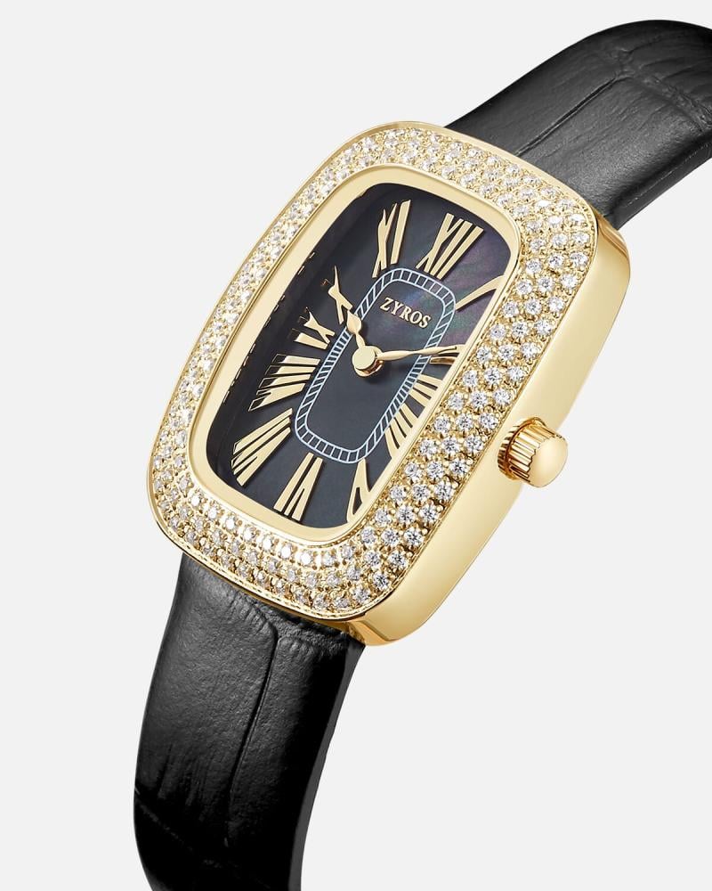تحفة زمنية تُحاكي سحر العصور الملكية، بإطار يلمع كنجوم الليل، وأرقام رومانية تعزف سيمفونية من الفخامة على ميناء أسود مخملي. سوارها الجلدي الأسود يضيف لمسة من القوة والرقي، لتكون هذه الساعة تجسيدًا للترف الأبدي.