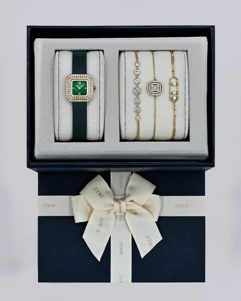 أناقة في كل إطلالة لك ، طقم متكامل يعكس الجمال و الرقي في أدق تفاصيله، بساعة متألقة بتصميم فريد من الجلد الفاخر، وثلاثة أساور تنبض بالفخامة والنعومة. مزيج من البريق والتناسق، صنع ليكون عنوانًا للذوق الرفيع