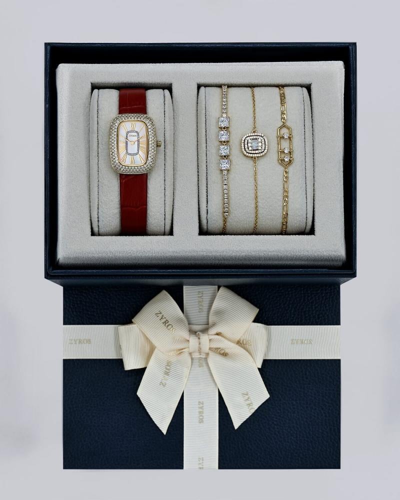 أناقة في كل إطلالة لك ، طقم متكامل يعكس الجمال و الرقي في أدق تفاصيله، بساعة متألقة بتصميم فريد من الجلد الفاخر، وثلاثة أساور تنبض بالفخامة والنعومة. مزيج من البريق والتناسق، صنع ليكون عنوانًا للذوق الرفيع
