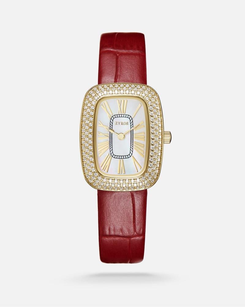 - السير: بلون أحمر من الجلد النباتي الفاخر، مقاوم للخدوش، مستدام، وصديق للبيئة، ويجمع بين المتانة والأناقة .