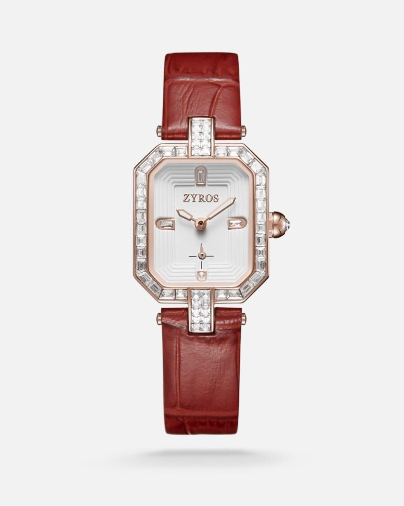 - السير: بلون أحمر من الجلد النباتي الفاخر، مقاوم للخدوش، مستدام، وصديق للبيئة، ويجمع بين المتانة والأناقة.