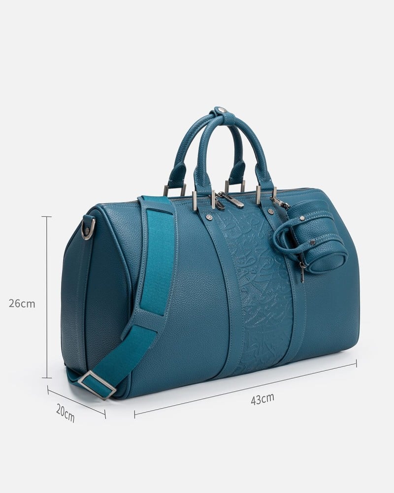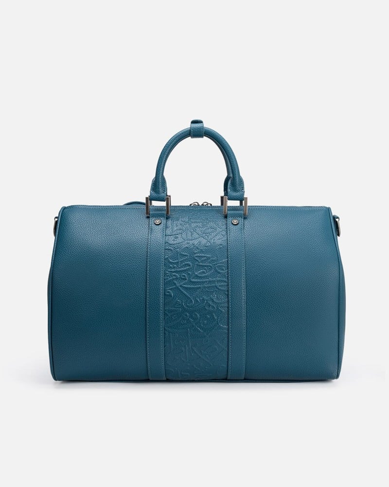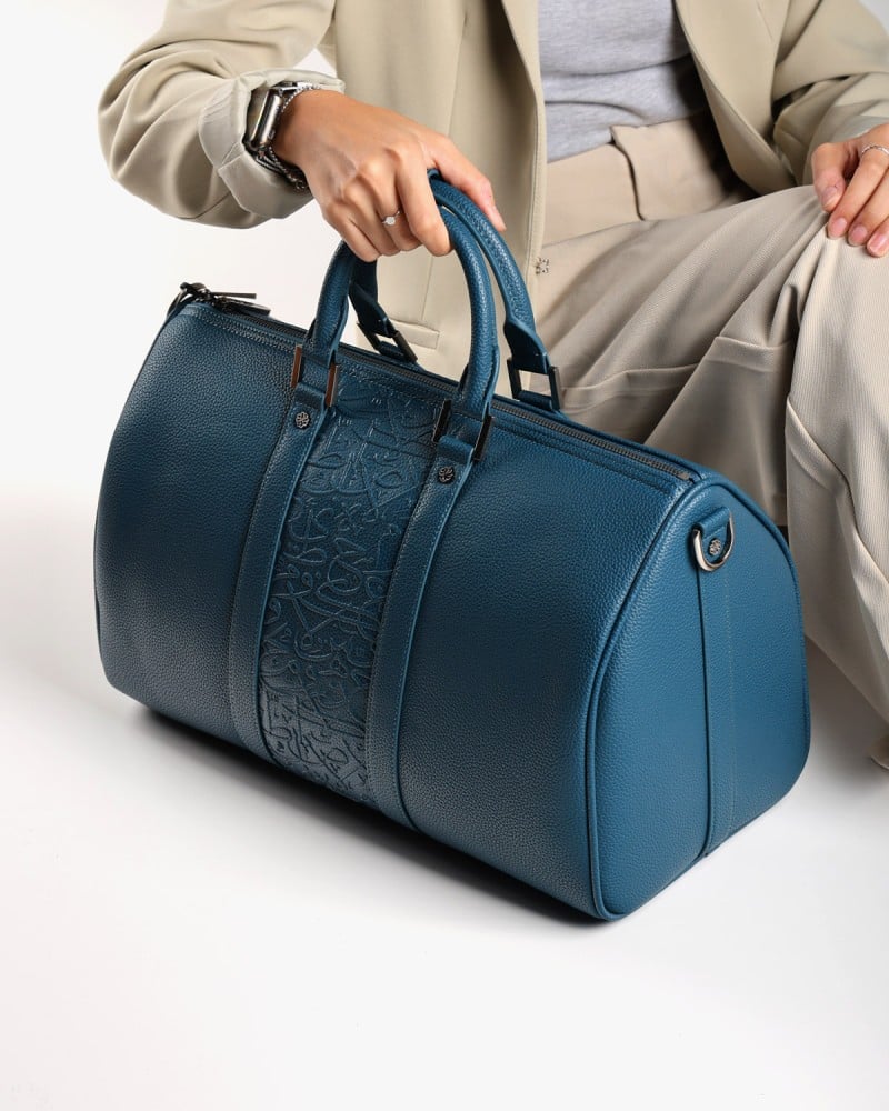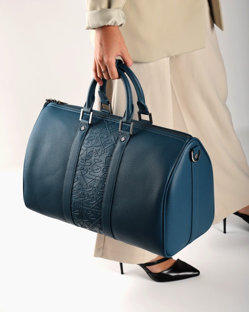 - شنطة من الجلد باللون الأزرق تتزين بزخارف الخط العربي