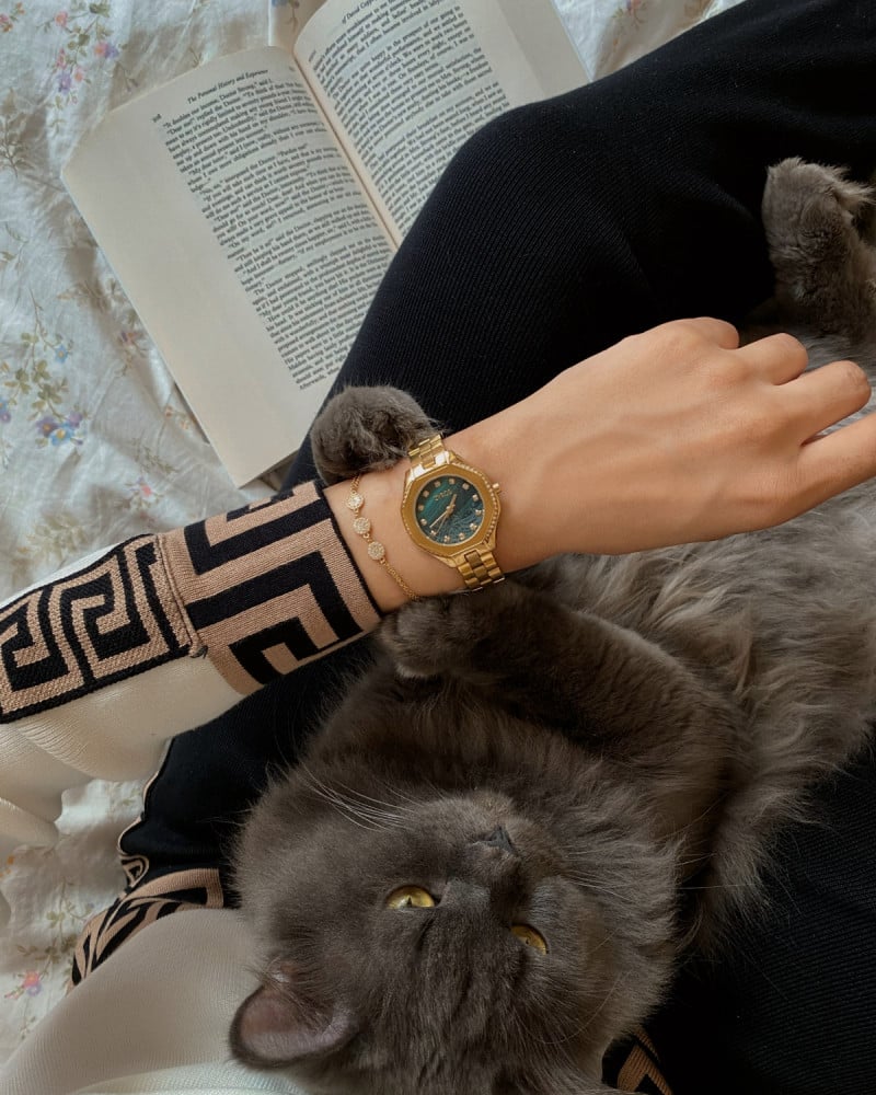 ساعة نسائية من ماركة زايروس بتصميم أنيق مفعم بالفخامه وإصدار حصري بمناسبة اليوم الوطني ، ساعة بسير من الستانلس ستيل باللون الذهبي ، ساعة بميناء بلون أخضر صدفي وبإطار عريض مرصع بفصوص الزركون ، تتميز الساعة بالنقوش العربية التي تزين الميناء وبعدد من الفصوص اللامعه في مكان الأرقام ، ساعه أنيقة ومناسبة لمناسباتك المميزة .