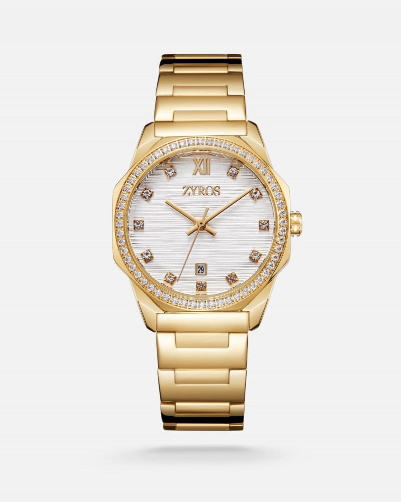 ساعة نسائية من ماركة زايروس بسير من الستانلس ستيل باللون الذهبي ، بتصميم يجمع بين الاناقة والتفرد ، تتميز ساعة زايروس بالميناء الهندسي باللون الأبيض وبعدد من فصوص الزركون التي تزين مكان الأرقام، بلاشك ستكون هذه الساعه هي القطعه المناسبة لأرتدائها في كل الأوقات .