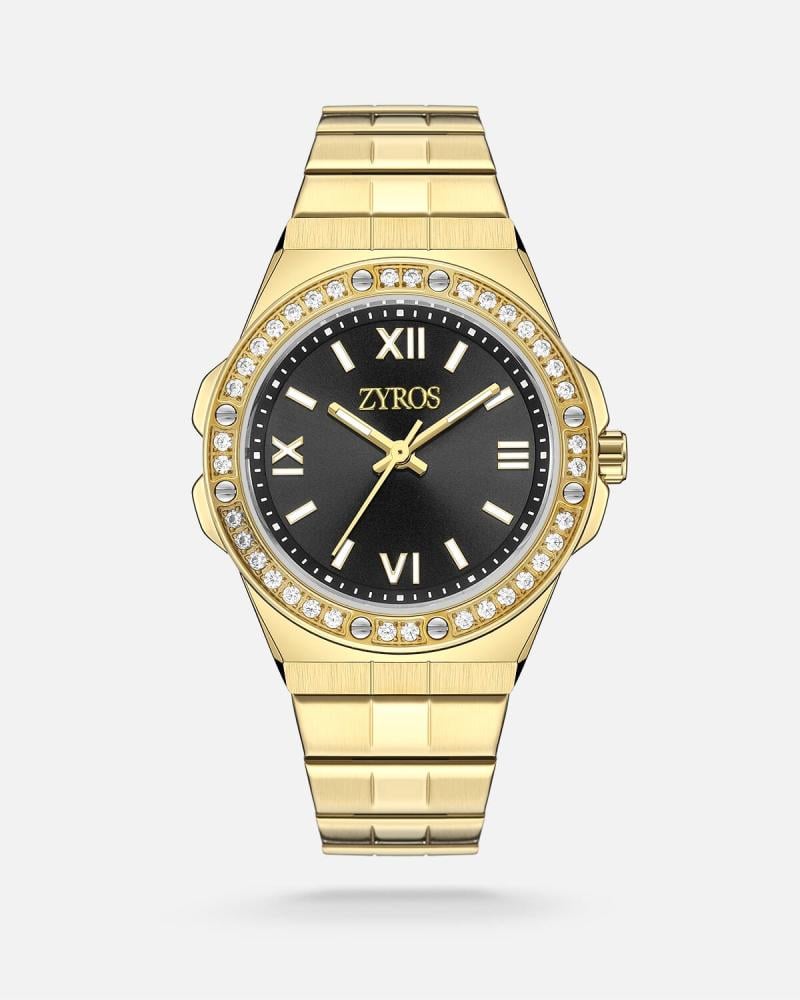 - الساعة بإطار بلون ذهبي يتزين بفصوص الزركون اللامع