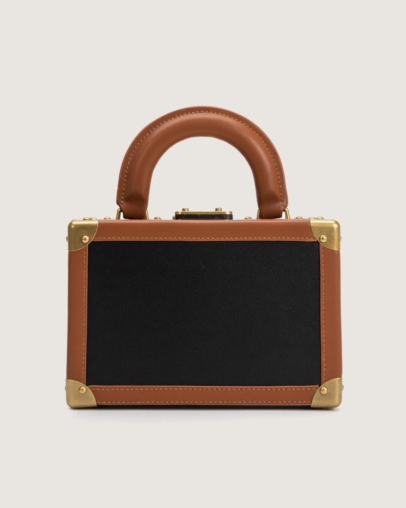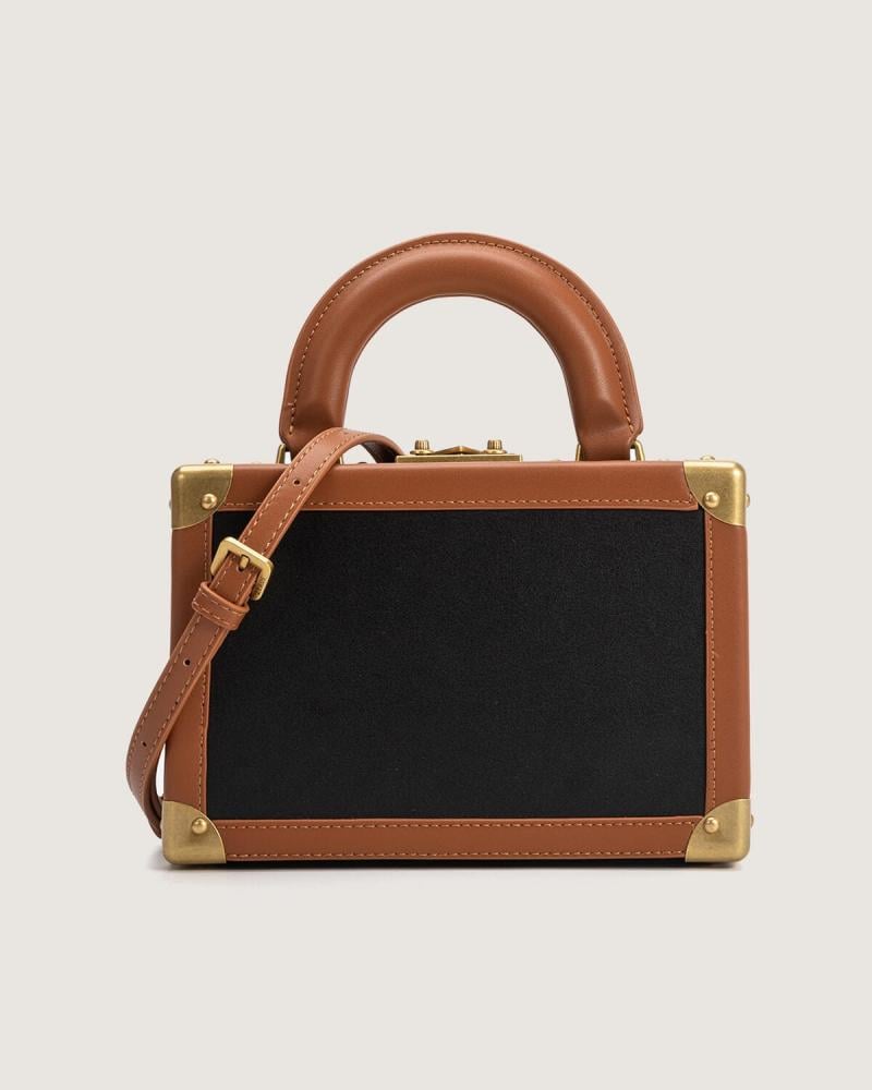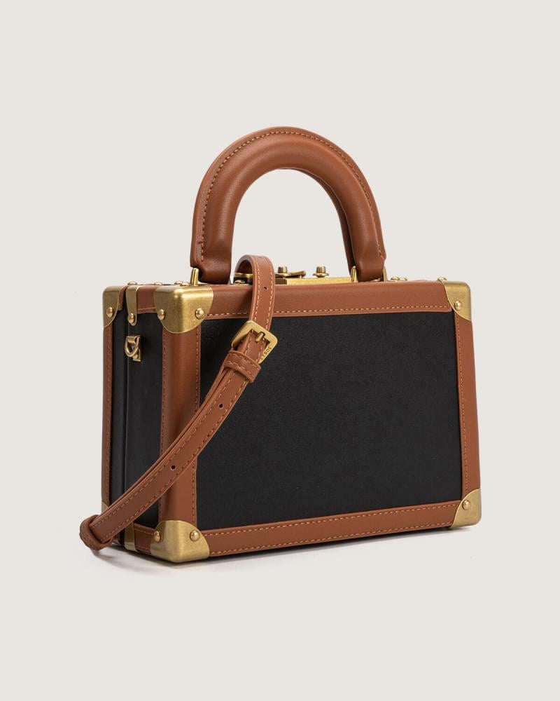 - شنطة من الجلد باللون الأسود والبني بيد مقوسة لسهولة حملها