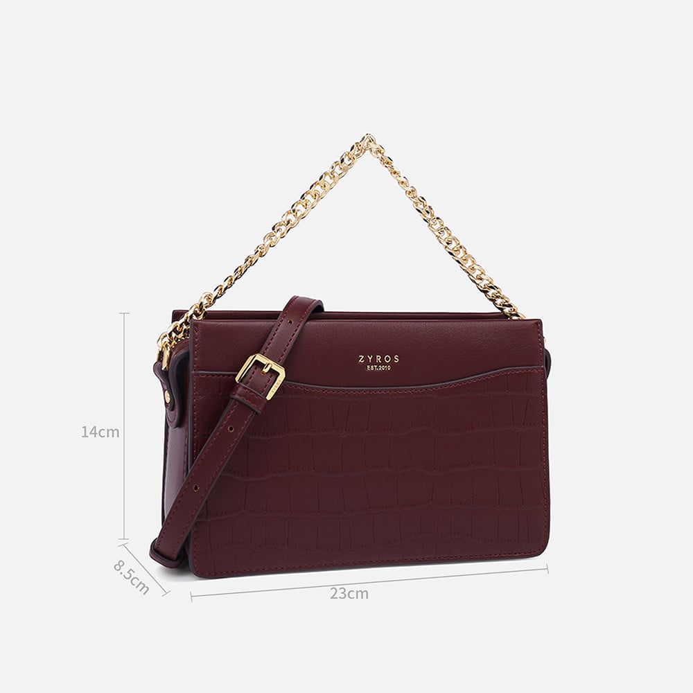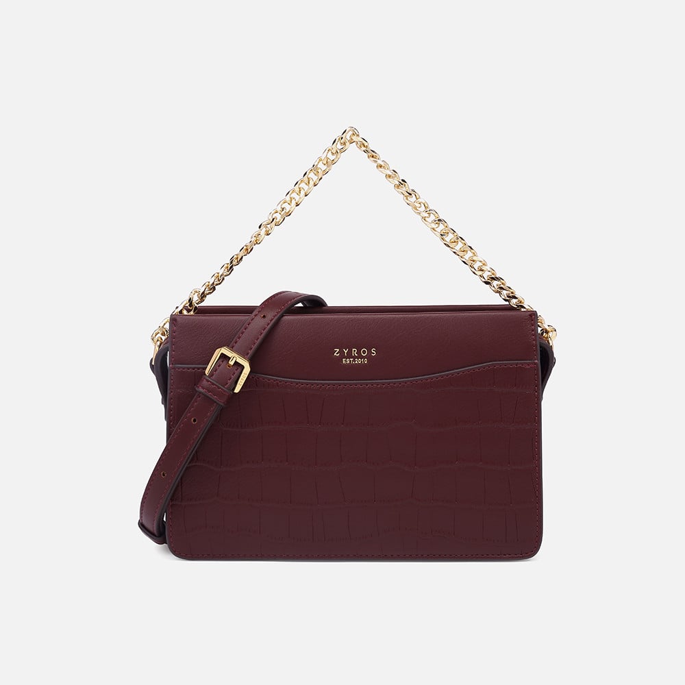 شنطه نسائيه من ماركة زايروس بتصميم عملي شبابي خفيف ، شنطة عمليه لكل يوم بخليط أنيق من الجلد الناعم والمنقوش باللون العودي ، تتميز الشنطه بسحاب إغلاق لسهوله فتحها ولضمان حفظ أغراضك الشخصيه ، شنطه عمليه صغيره تناسب إطلالتك اليوميه للمناسبات السريعه . تتميز الشنطه بيد من السلسال العريض لحملها بيدك او بحماله الكتف الطويله التي يمكنك التحكم بطولها ولبسها بطريقه كروس لإطلاله كاجول وأكثر جاذبيه .