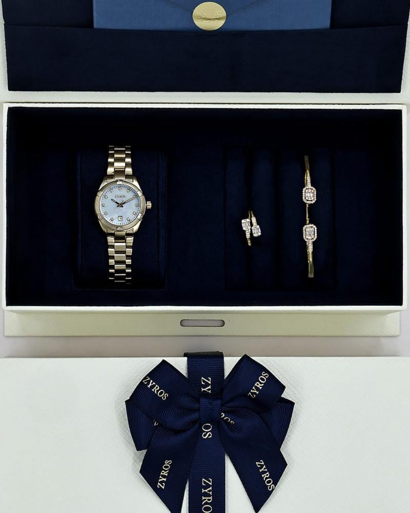 أناقة تلامس الزمن ، طقم متكامل يعكس الجمال و الأصالة في أدق تفاصيله، بساعة متألقة بتصميم كلاسيك لكل يوم، وطقم من اسوارة وخاتم تنبض بالفخامة والنعومة. مزيج من البريق والتناسق، صنع ليكون عنوانًا للذوق الرفيع