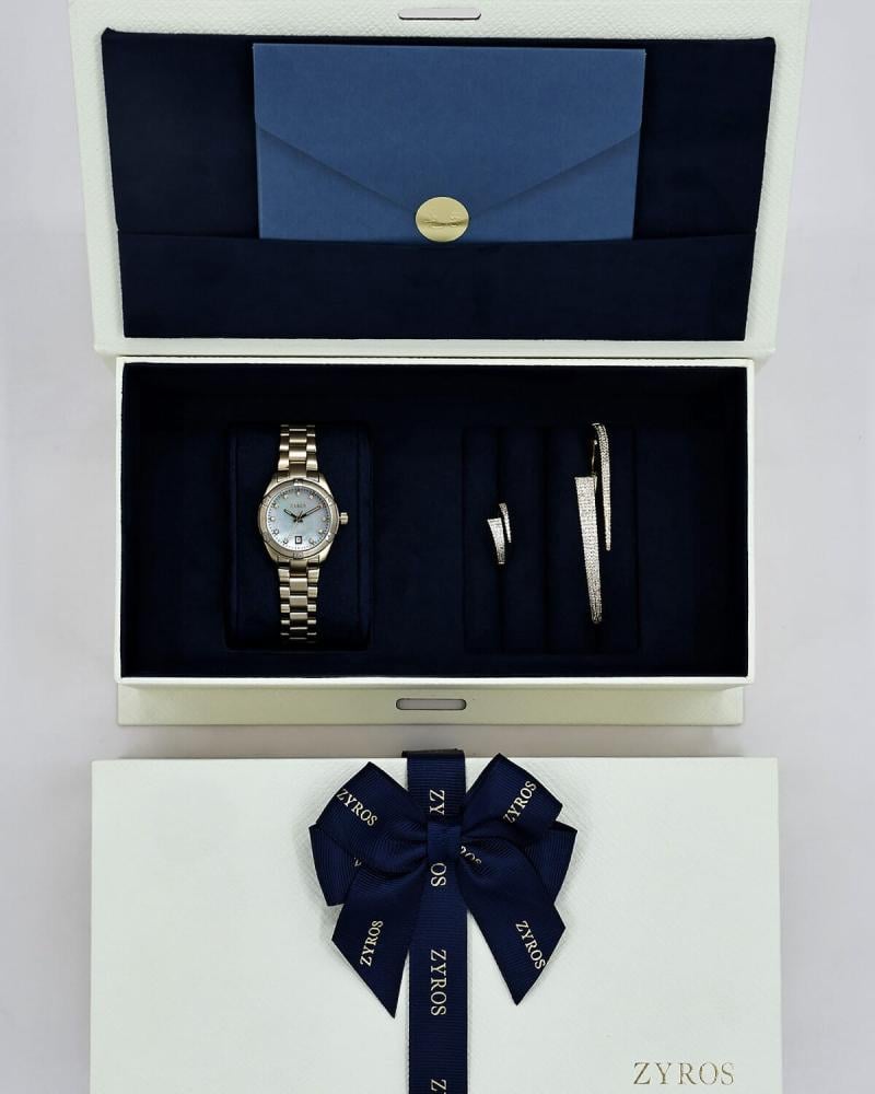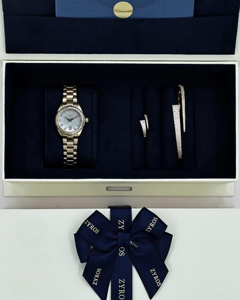 أناقة تلامس الزمن ، طقم متكامل يعكس الجمال و الأصالة في أدق تفاصيله، بساعة متألقة بتصميم كلاسيك لكل يوم، وطقم من اسوارة وخاتم تنبض بالفخامة والنعومة. مزيج من البريق والتناسق، صنع ليكون عنوانًا للذوق الرفيع