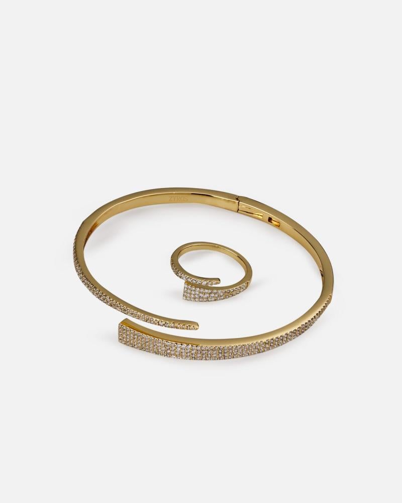 - الأكسسوار: طقم من اسوارة وخاتم باللون الذهبي بتصميم راقي ومرصع بفصوص الزركون اللامعه