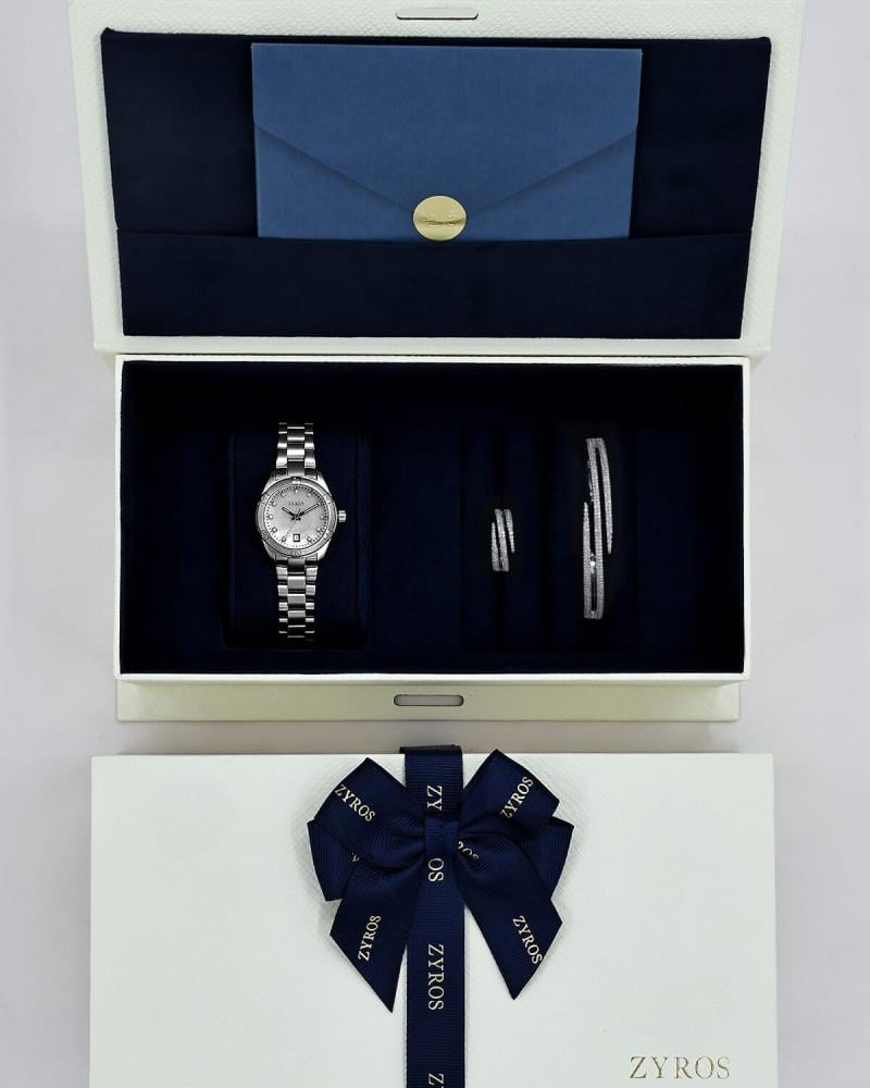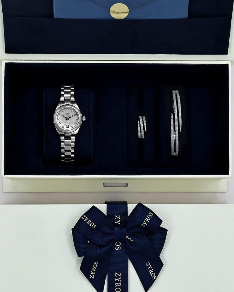 أناقة تلامس الزمن ، طقم متكامل يعكس الجمال و الأصالة في أدق تفاصيله، بساعة متألقة بتصميم كلاسيك لكل يوم، وطقم من اسوارة وخاتم تنبض بالفخامة والنعومة. مزيج من البريق والتناسق، صنع ليكون عنوانًا للذوق الرفيع