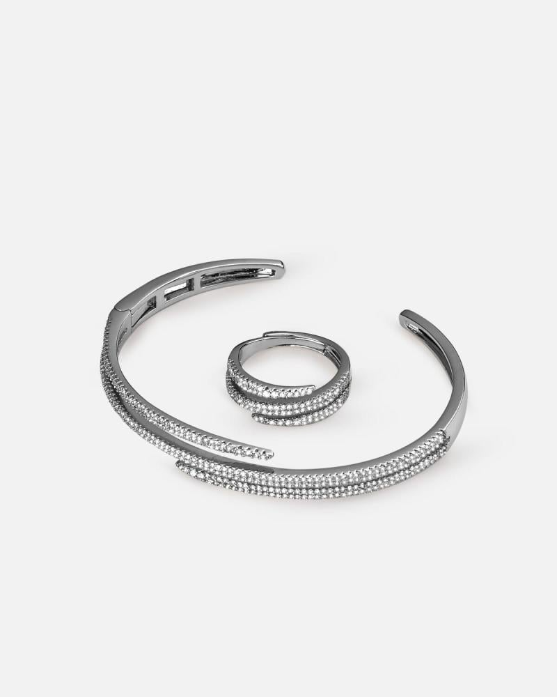 - الأكسسوار: طقم من اسوارة وخاتم باللون الفضي بتصميم راقي ومرصع بفصوص الزركون اللامعه