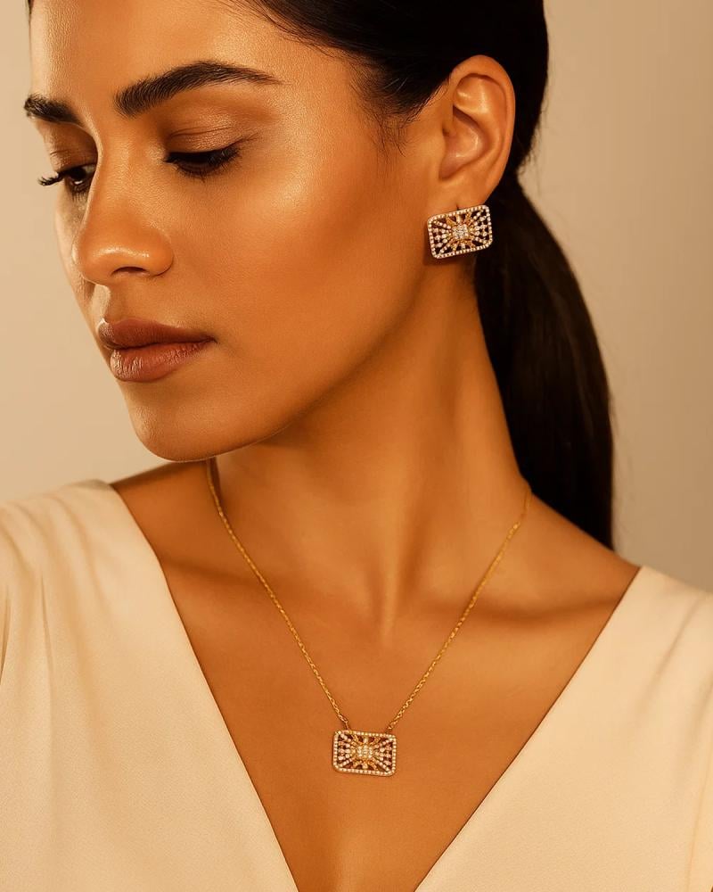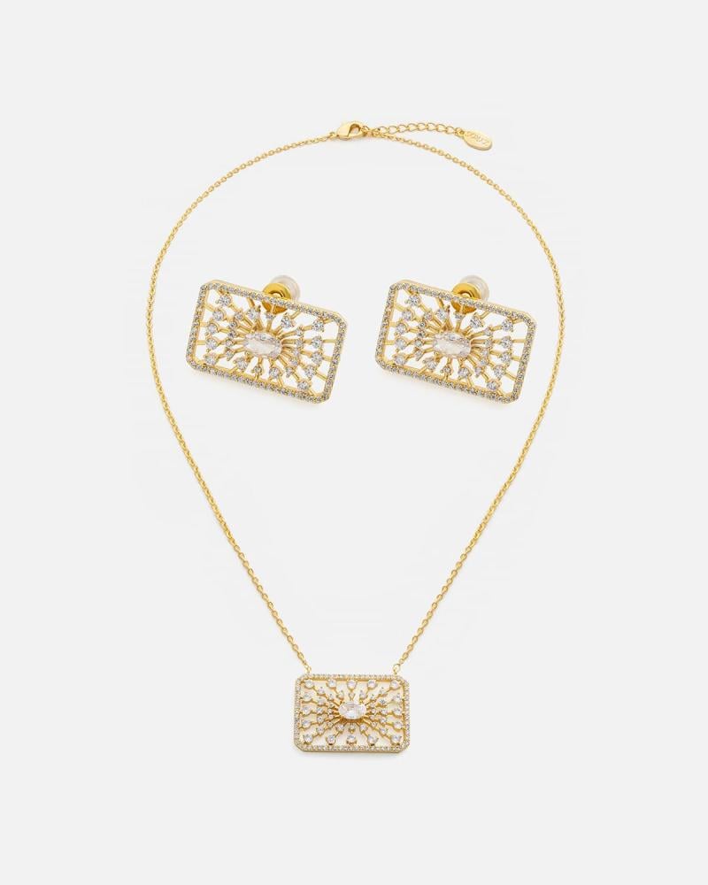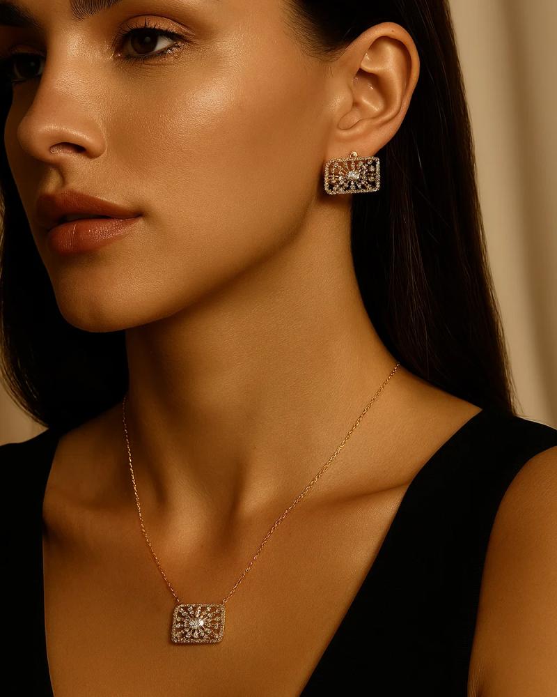 - يتميز الطقم بتصميم حلية بشكل مستطيل مفرغ والمرصع بفصوص من الزركون البراق