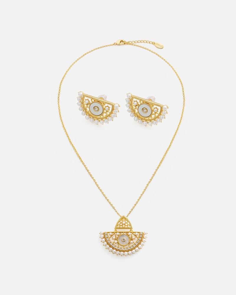 - يتميز الطقم بتصميمه المميز والمرصع بأحجار من اللؤلؤ