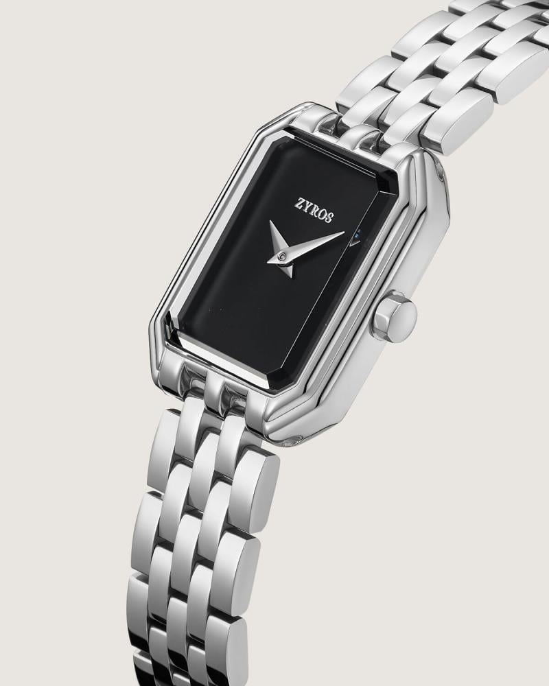 ساعة نسائية تنبض بالأنوثة والفخامة، يتألق ميناؤها المستطيل بهدوء يروي حكاية كلاسيكية لزمن راقٍ لا يبهت. خطوطها الهادئة تنسجم مع سوارها لتصنع حضورًا استثنائيًا، كنبضة فخر خفيّة تلامس القلب وتُذكّر بحضور مميز يظل شامخًا في الوجدان.