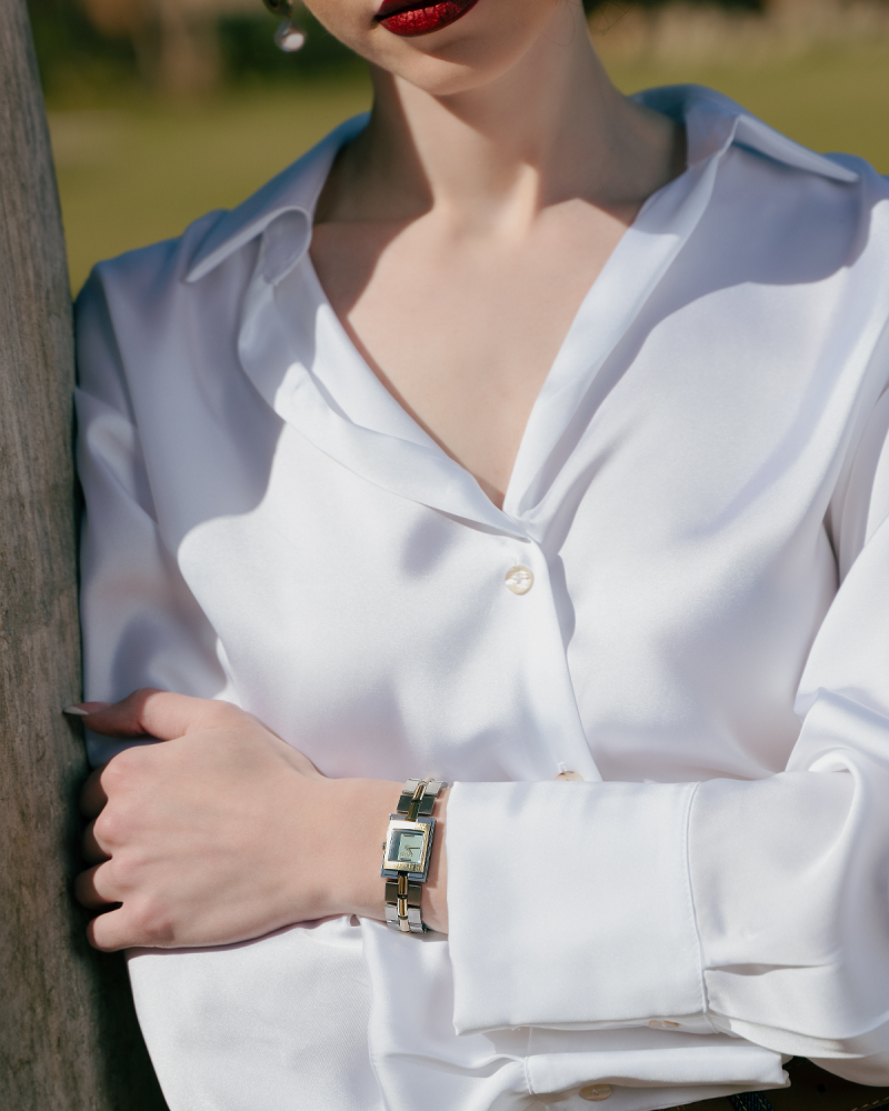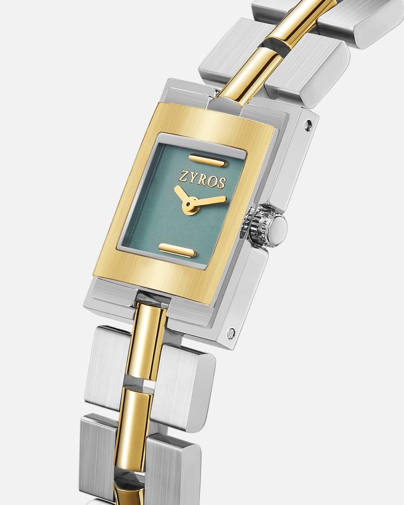 - ساعة بميناء باللون الأزرق الفاتح بشكل مربع وبإطار بلون ذهبي وفضي