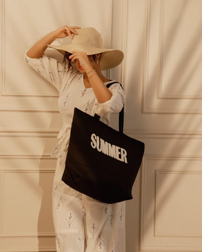 - وصف الشنطة: تتميز الشنطة بحجم واسع وتتزين بكلمة صيف بلون أبيض، شنطة لإطلالتك في الصيف .