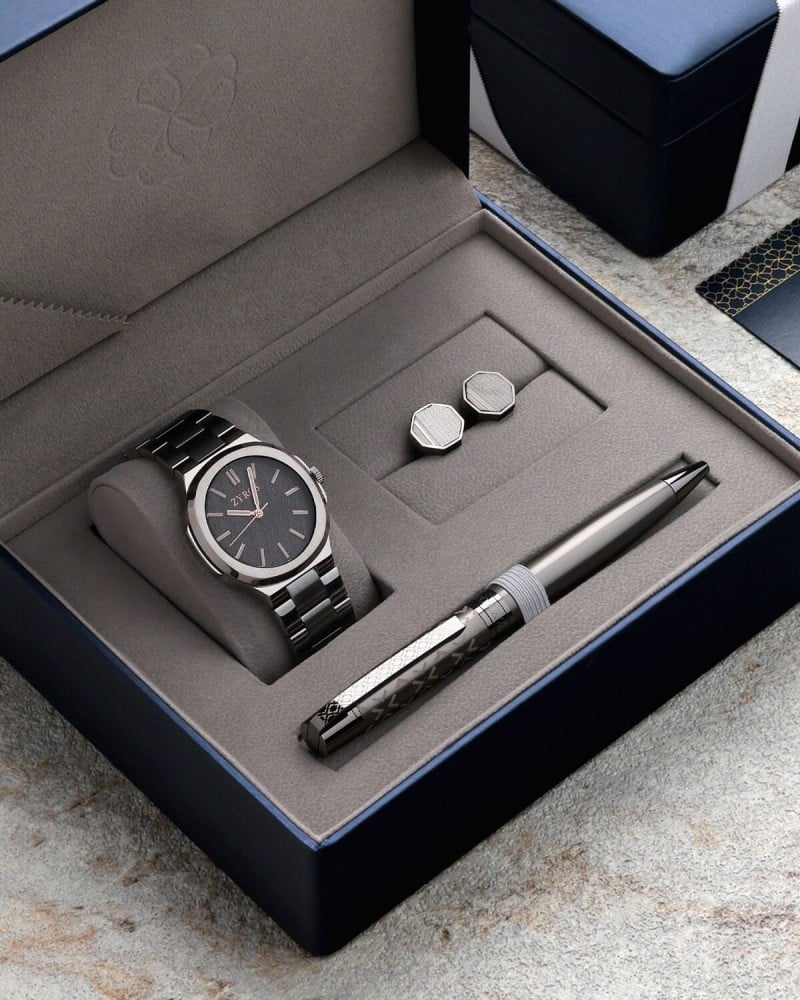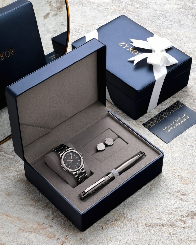 - هدية رجالية بتصميم ملكي تتكون من ساعة و كبك وقلم