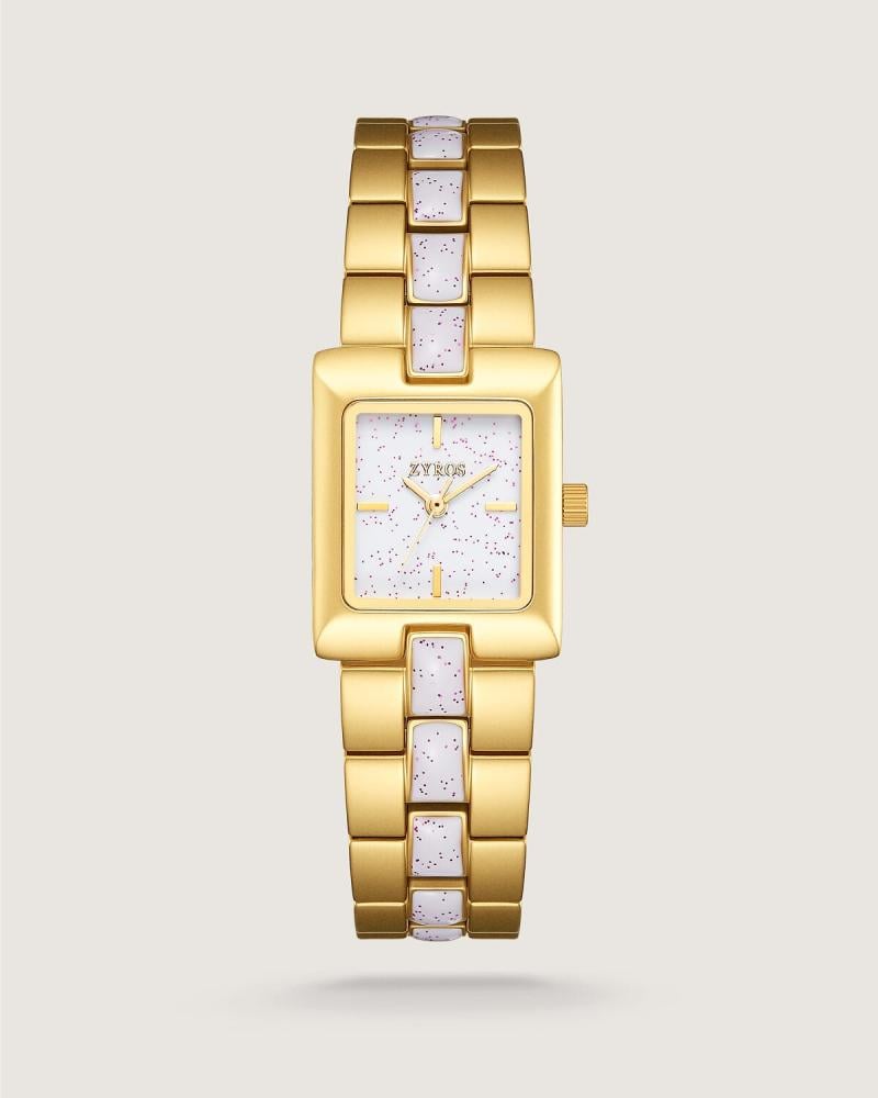 ساعة نسائية تنبض بالرقي والفخامة، يتألق ميناؤها الصغير بلون صدفي كسماء تتزين بالنجوم تروي حكاية زمن راقٍ لا يبهت. خطوطها الهادئة تنسجم مع سوارها الذهبي لتصنع حضورًا استثنائيًا، كنبضة فخر خفيّة تلامس القلب وتُذكّر بروح وطن عزيز يظل شامخًا في كل رواية.
