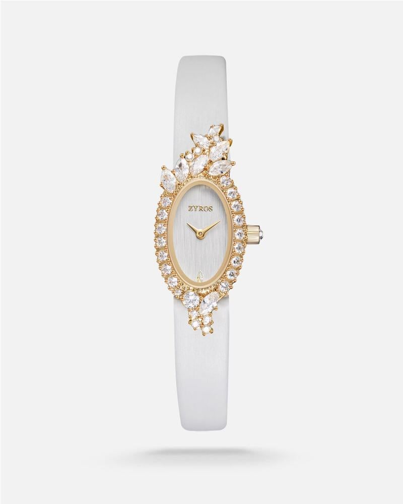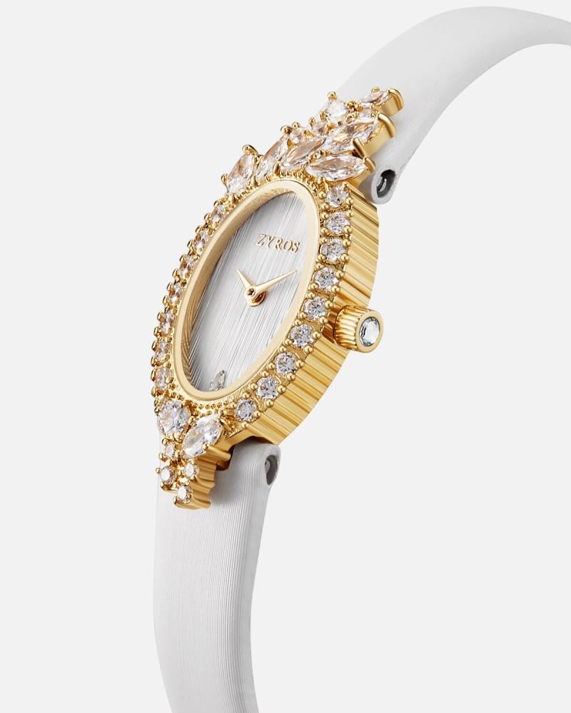 هذه الساعة الفاخرة تجسد الأناقة الكلاسيكية بروح عصرية راقية. يزينها إطار بيضاوي مرصع بأحجار الزركون الأنيقة تعكس لمسة من الفخامة، فيما يضفي الميناء عمقًا وسحرًا خاصًا، . أما السوار الجلدي الرفيع فيعزز الطابع الكلاسيكي ويضمن راحةً استثنائية عند الارتداء. هذه الساعة ليست مجرد أداة لمعرفة الوقت، بل هي قطعة فنية تعبر عن الذوق الرفيع والشخصية الفريدة لمن يرتديها.