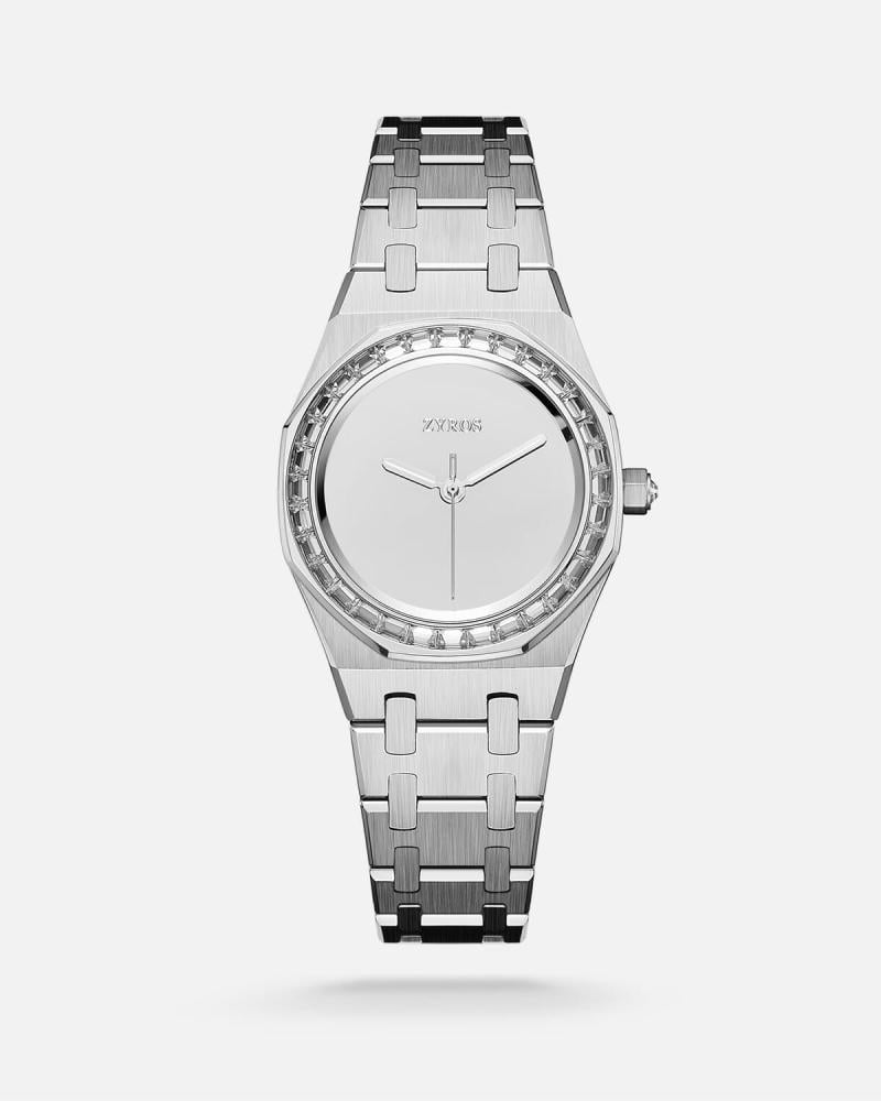 - الإطار: باللون الفضي المصقول بشكل بارز والمرصع بفصوص الزركون البراقة.
