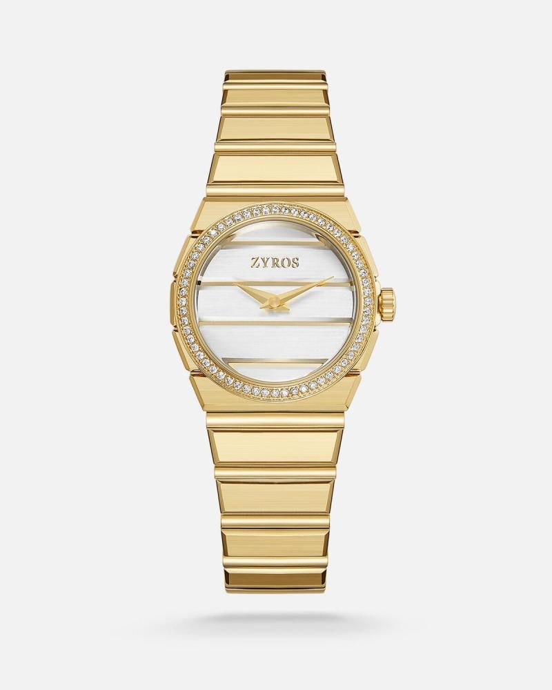 - الإطار: باللون الذهبي مرصع بفصوص الزركون اللامع.