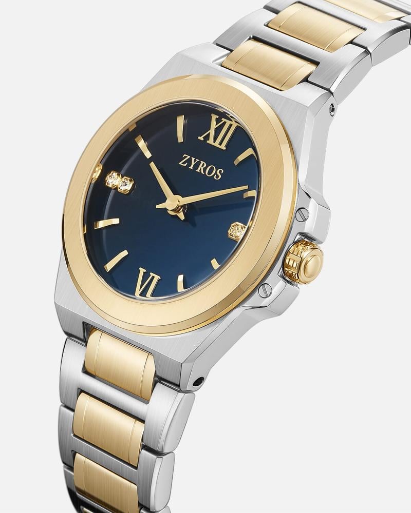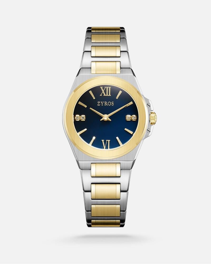 أيقونة الأناقة العصرية، بتصميم يجمع بين الفخامة والجرأة يعكس بريق شخصيتك. ميناء تتناغم فيه العقارب والمؤشرات الذهبية والفصوص البراقة ، لتمنحك قراءة واضحة للوقت و تضيف لمسة من التعقيد والتفرد. سوار من الفولاذ المقاوم للصدأ، بتصميم متناسق، يمنحك راحة لا مثيل لها، وثباتًا يواكب إيقاع حياتك. "حيث يلتقي التصميم العصري باللمسة الكلاسيكية، لتكون إضافة مميزة إلى إطلالتك."