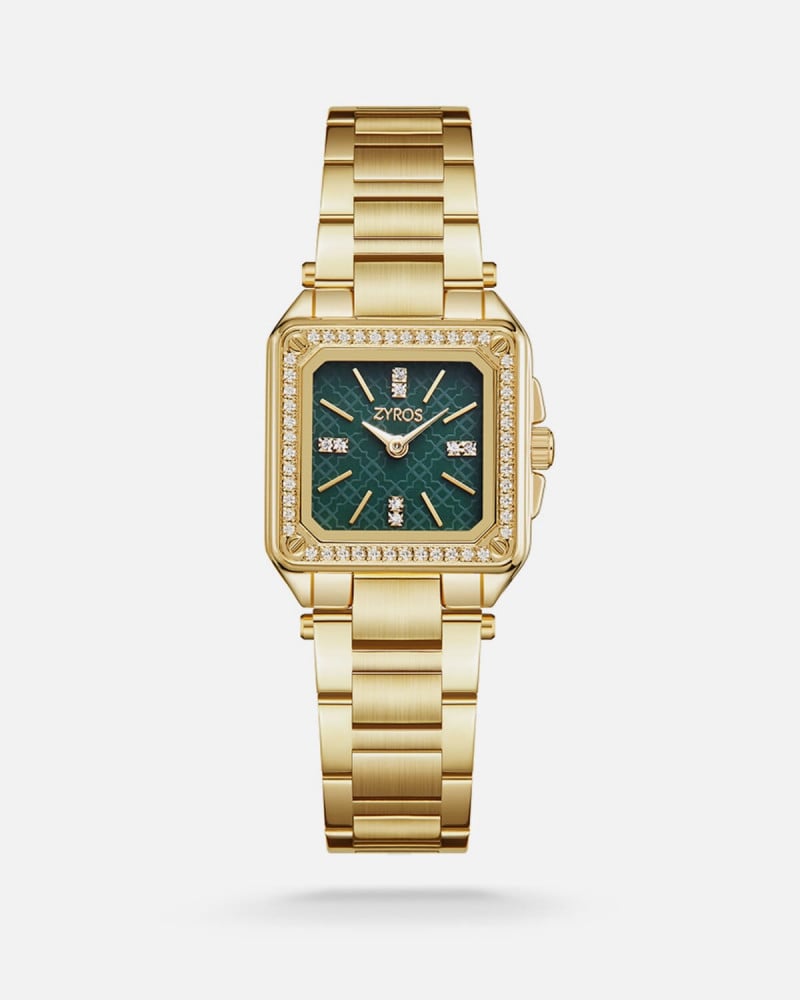 ساعة نسائيه من ماركة زايروس بتصميم أنيق وبلمسه أنثويه ساحره ، ساعه بسوار من الستانلس ستيل باللون الذهبي، تتميز الساعه بالميناء بالشكل المربع بلون أخضر ، يضم ميناء الساعة أربعه فصوص زيركون لامعه تزيد من أناقه الساعه وبإطار مرصع بفصوص الزركون البراق ، إختيارك لهذه الساعه من زايروس سيكون الإختيار المفضل لك لإطلاله كل يوم ، لا تترددي في إضافه الساعة لمجموعتك المفضله .