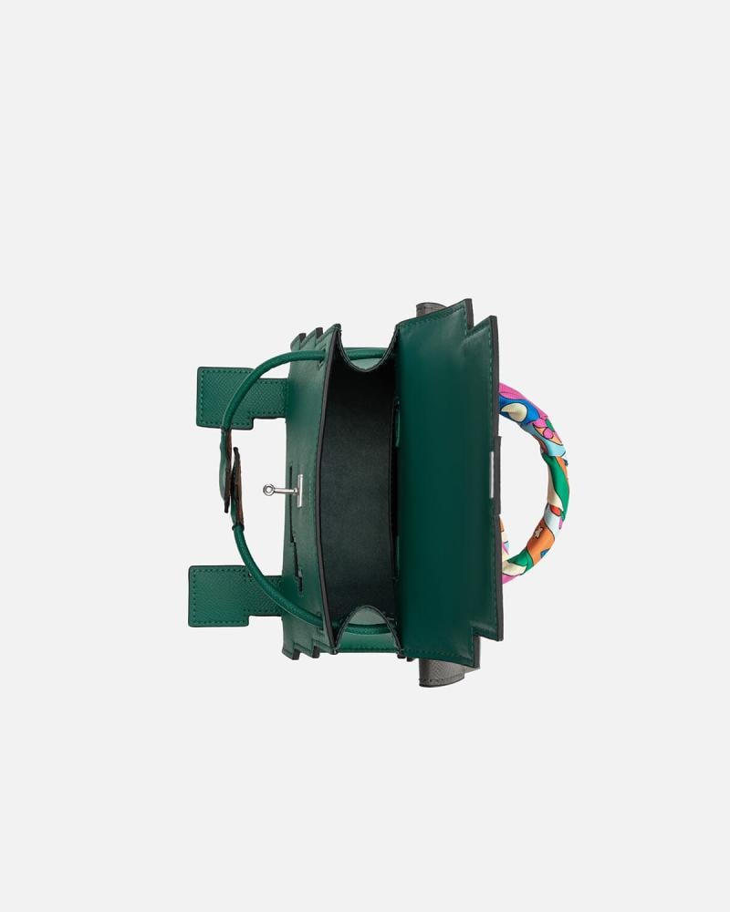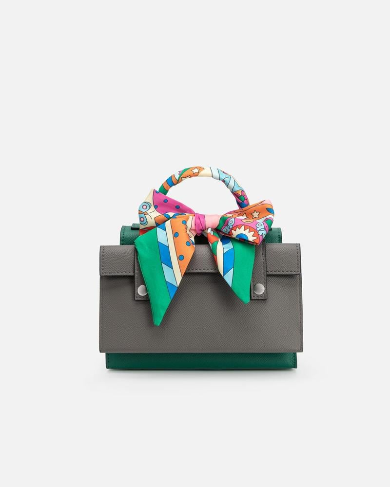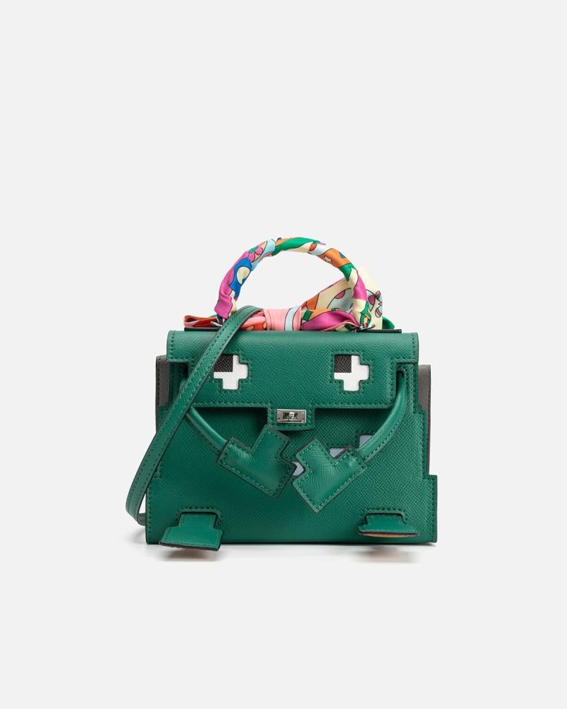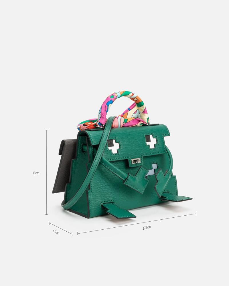 هذه الشنطة تبدو وكأنها خرجت من عالم رقمي ساحر، تجمع بين الطابع الجريء والمرح بتصميمها المستوحى من رسومات البكسل. بملامح وجه مطرز على الجلد، وحواف بتفاصيل هندسية دقيقة، تعكس أسلوبًا عصريًا مستقبليًا. أما الشنطة الصغيرة المثبتة في الخلف بإبزيم معدني، فهي كأنها “حقيبة حقيبة” أو سر صغير يحمله التصميم، تضيف بُعدًا عمليًا ولمسة مفاجئة، مثالية لإخفاء مقتنياتك الثمينة بأسلوب أنيق.