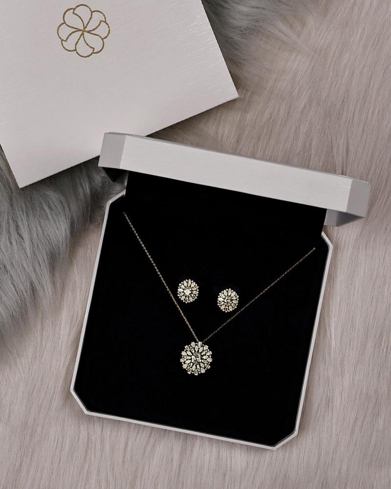 - يتميز السلسال والحلق بتصميم مميز مرصع بفصوص الزركون وبحجر زركون بلون فضي