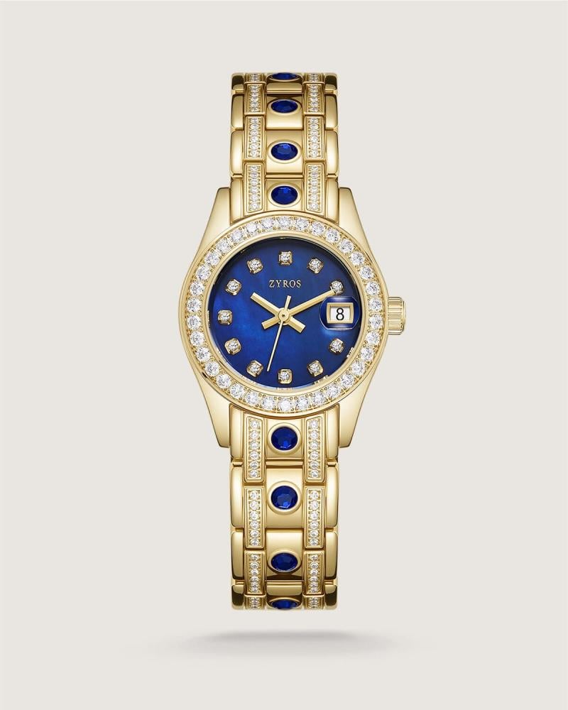 - السير: بلون ذهبي ويتزين بفصوص بلون أزرق وفصوص من الزركون سير من الستيل الفولاذ المقاوم للصدأ والذي يتميز بخفة وزنه، ومقاومته العالية للتآكل والصدأ، مما يجعله خيارًا مستدامًا .